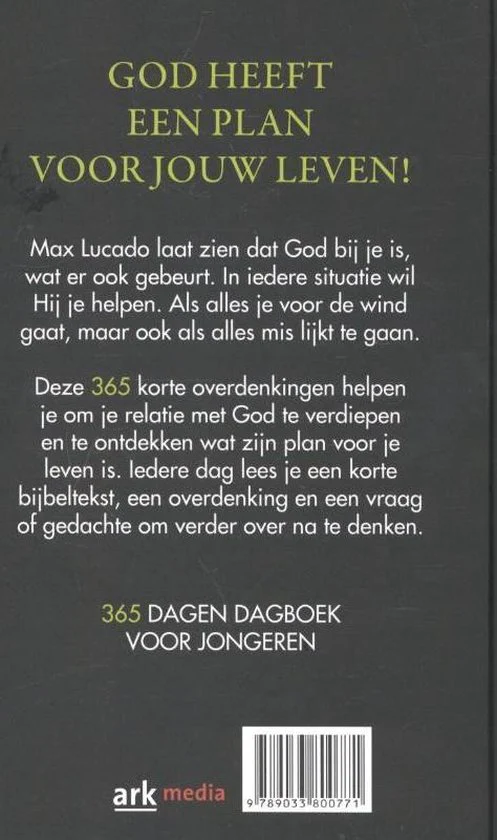 Eindelijk een dagboek voor jongeren vanaf 15 jaar van Max Lucado! Pakkende stukjes, korte zinnen en een heldere boodschap. Wat Lucado doet voor volwassenen en kinderen, kan hij ook voor jongeren. Het leven voor jongeren is lang niet altijd makkelijk. Lucado wil hen aansporen om leiding, troost en bemoediging voor hun leven te zoeken in de Bijbel. Dat doet hij op aansprekende, laagdrempelige wijze met overdenkingen over vertrouwen, gehoorzaamheid maar ook wijsheid, pesten, alcohol en zelfbeeld. Elke dag is hetzelfde opgebouwd; een bijbeltekst, een korte inspirerende overdenking die de nadruk legt op vertrouwen en de plannen die God voor de lezer heeft. Met handig leeslint. One God One Plan One Life helpt tieners bij het omgaan met de verleidingen, stress en keuzes die horen bij hun levensfase door te focussen op een van de basisdingen in het leven: hun relatie met God. Aantrekkelijk uitgevoerd met binnenwerk in 2 kleuren, leeslint en hardcover in handzaam formaat.