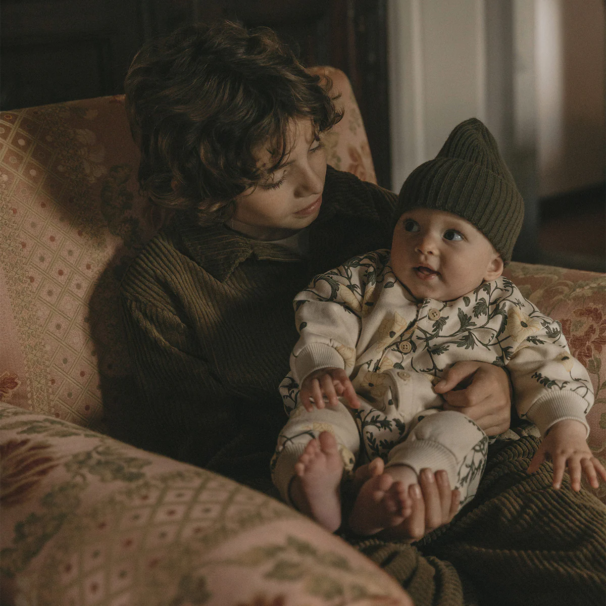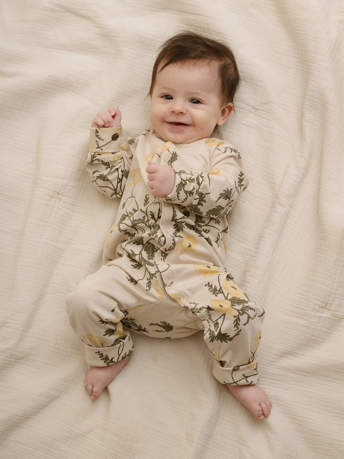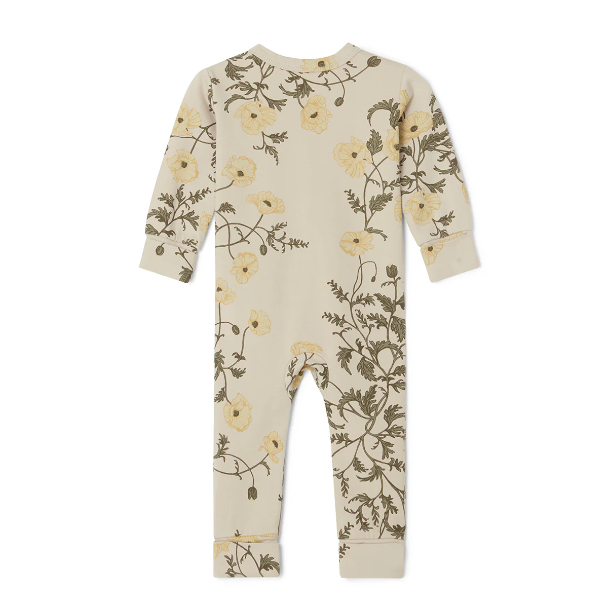 Boxpakje van Garbo & Friends met een leuk design van klimplanten en bloemen. De basiskleur van Onesie Flos is beige en het print heeft groene en gele tinten.