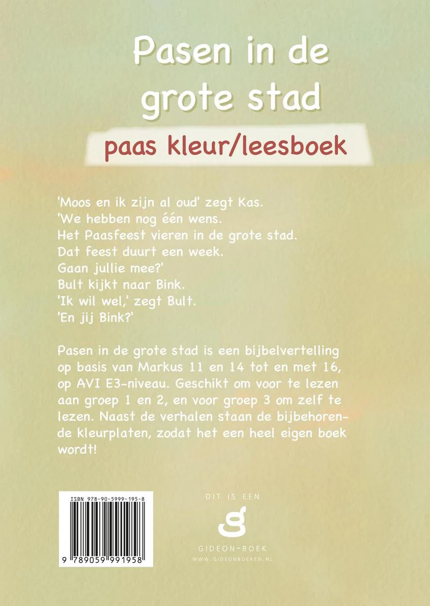 ‘Moos en ik zijn al oud’ zegt Kas. ‘We hebben nog één wens. Het Paasfeest vieren in de grote stad. Dat feest duurt een week. Gaan jullie mee?’ Bult kijkt naar Bink. ‘Ik wil wel,’ zegt Bult. ‘En jij Bink?’ Pasen in de grote stad is een bijbelvertelling op basis van Markus 11 en 14 tot en met 16, op AVI E3-niveau. Geschikt om voor te lezen aan groep 1 en 2, en voor groep 3 om zelf te lezen. Naast de verhalen staan de bijbehorende kleurplaten, zodat het een heel eigen boek wordt!