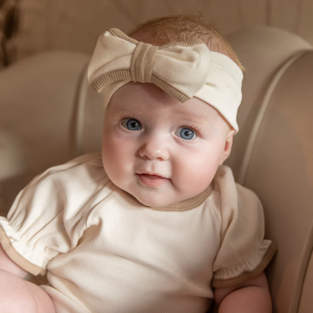 Hoofdbandje met strik voor baby’s van het Koreaanse merk Peekaboo. De kleur is creme. De strik van het baby haarbandje heeft mocha/taupe kleurige details.