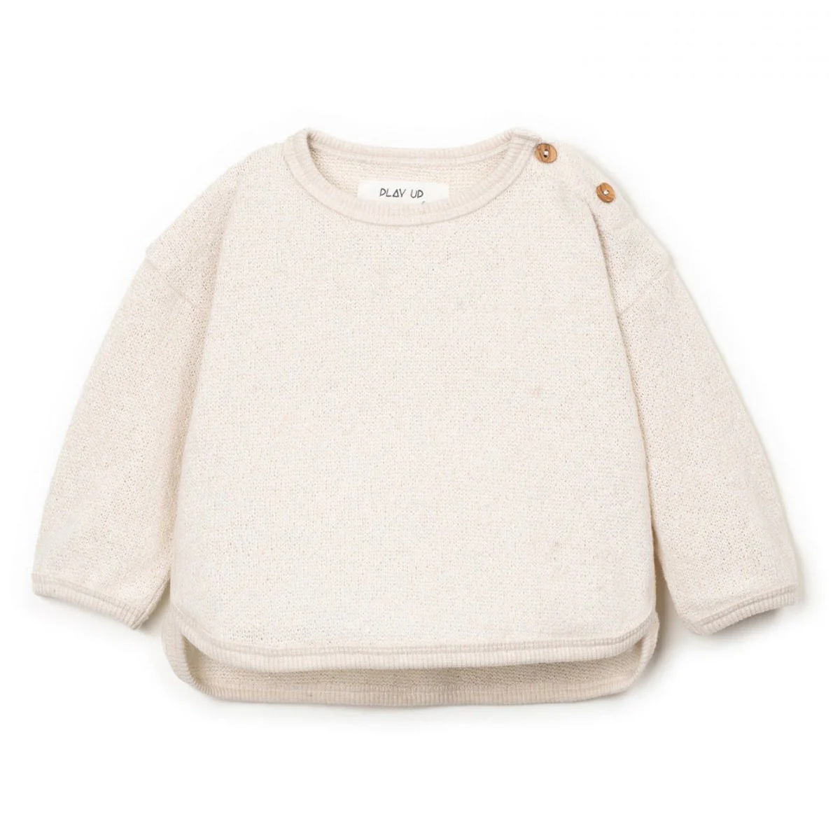 Neutrale baby sweater van super zacht jersey materiaal. De kleur bio resin is een ecru/offwhite kleur. Dit model van Play Up heeft twee kokos knoopjes bij de schouder en een rond gestikte onderkant.