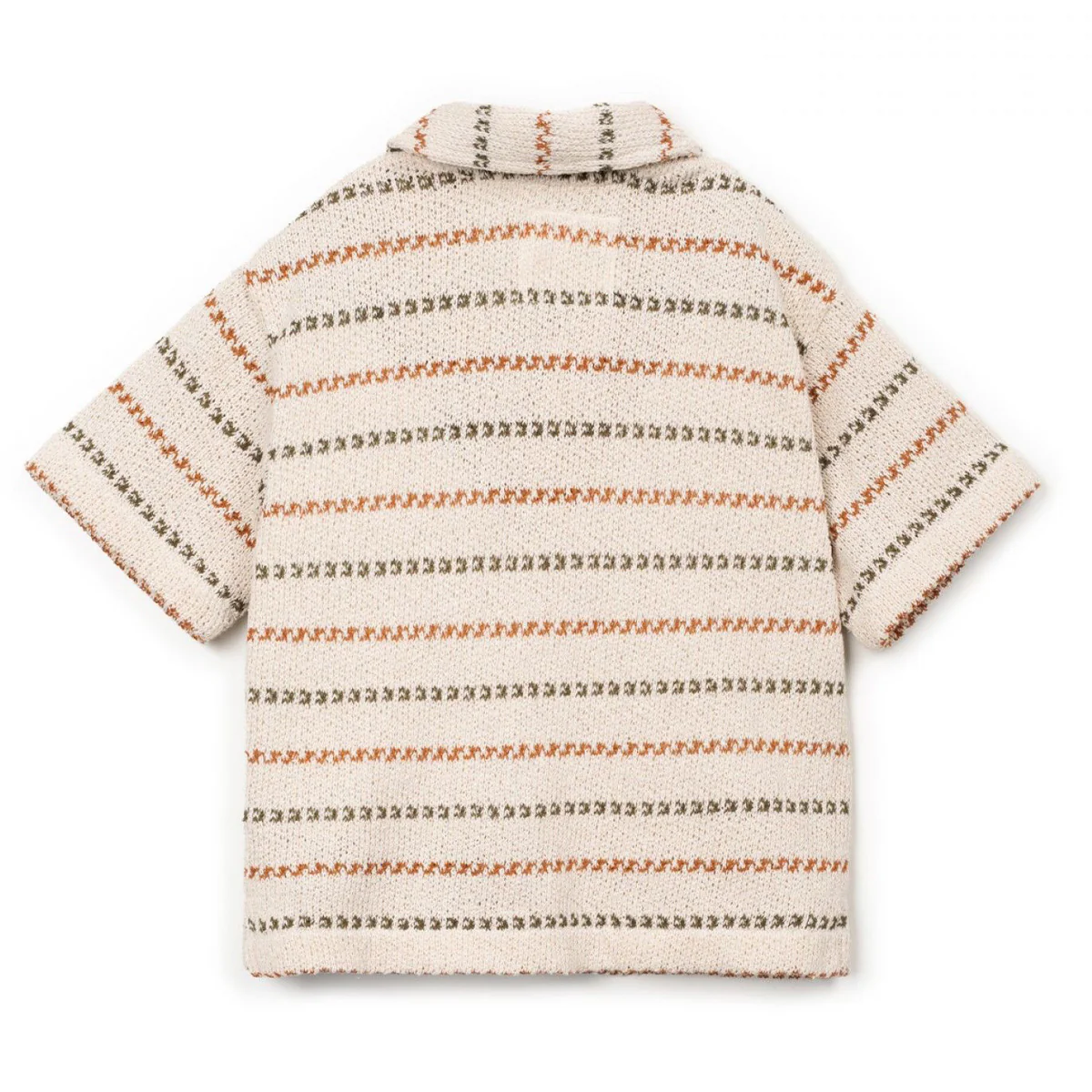 Toffe, nonchalant gebreide jersey blouse voor baby jongens. Deze blouse is luchtig gebreid. Leuk om zowel open als dicht te dragen. De blouse heeft een gestreept patroon. De basiskleur is een naturel offwhite en de strepen hebben de kleuren olijf groen en terracotta oranje. Het shirt heeft een blouse kraag met V-hals, korte mouwen, een opening aan de voorkant met kokosnoot knopen.