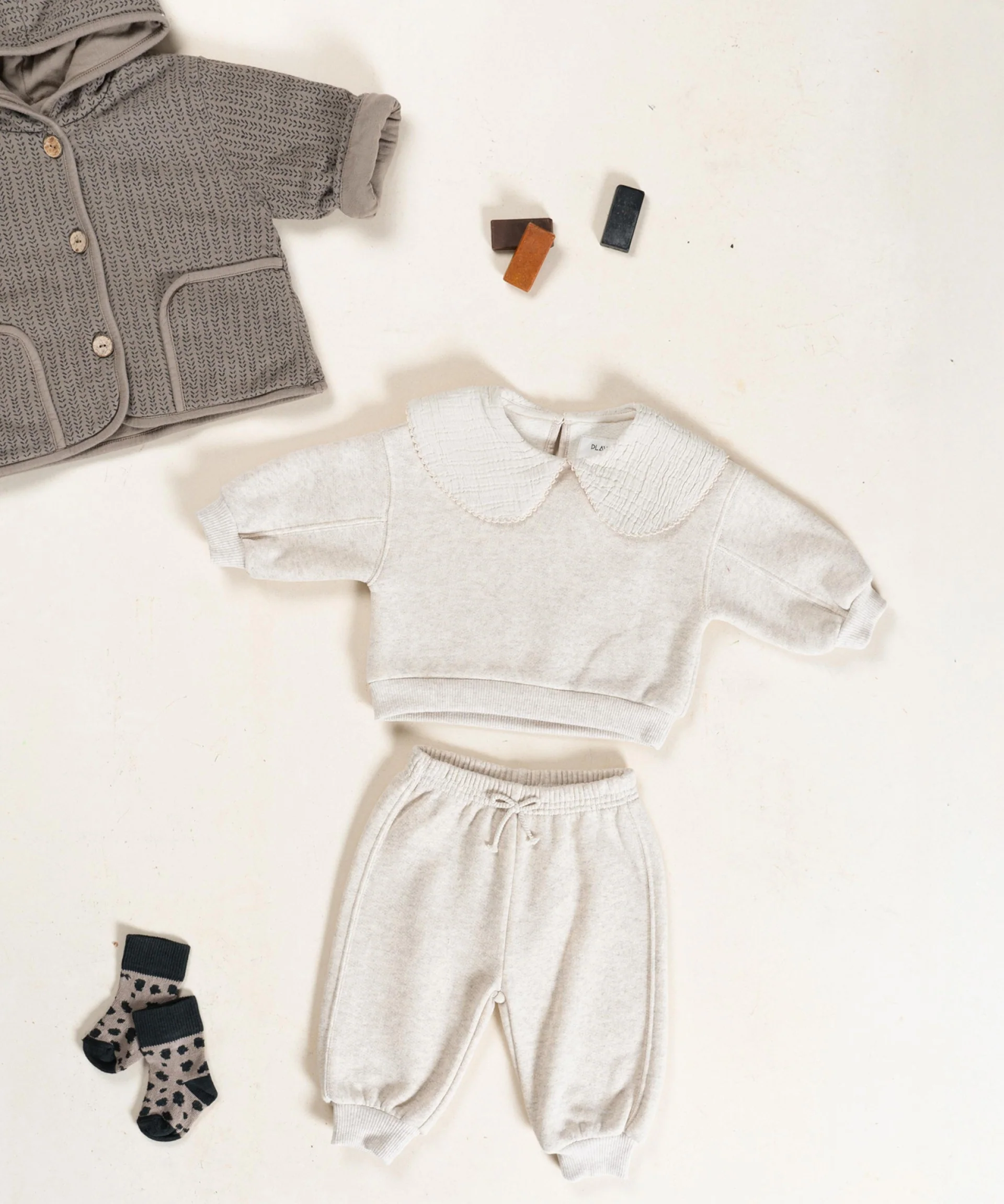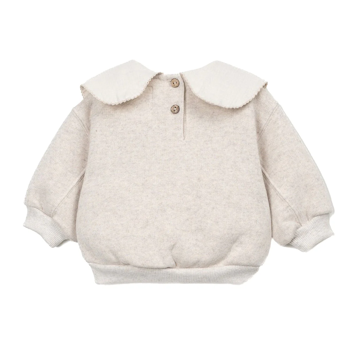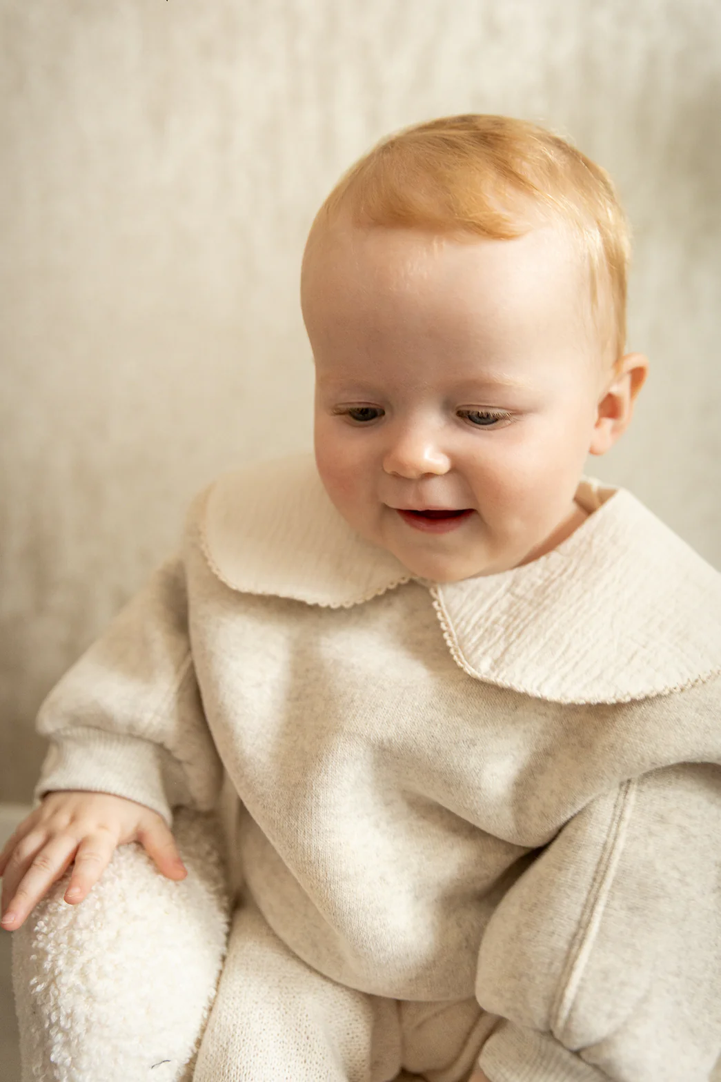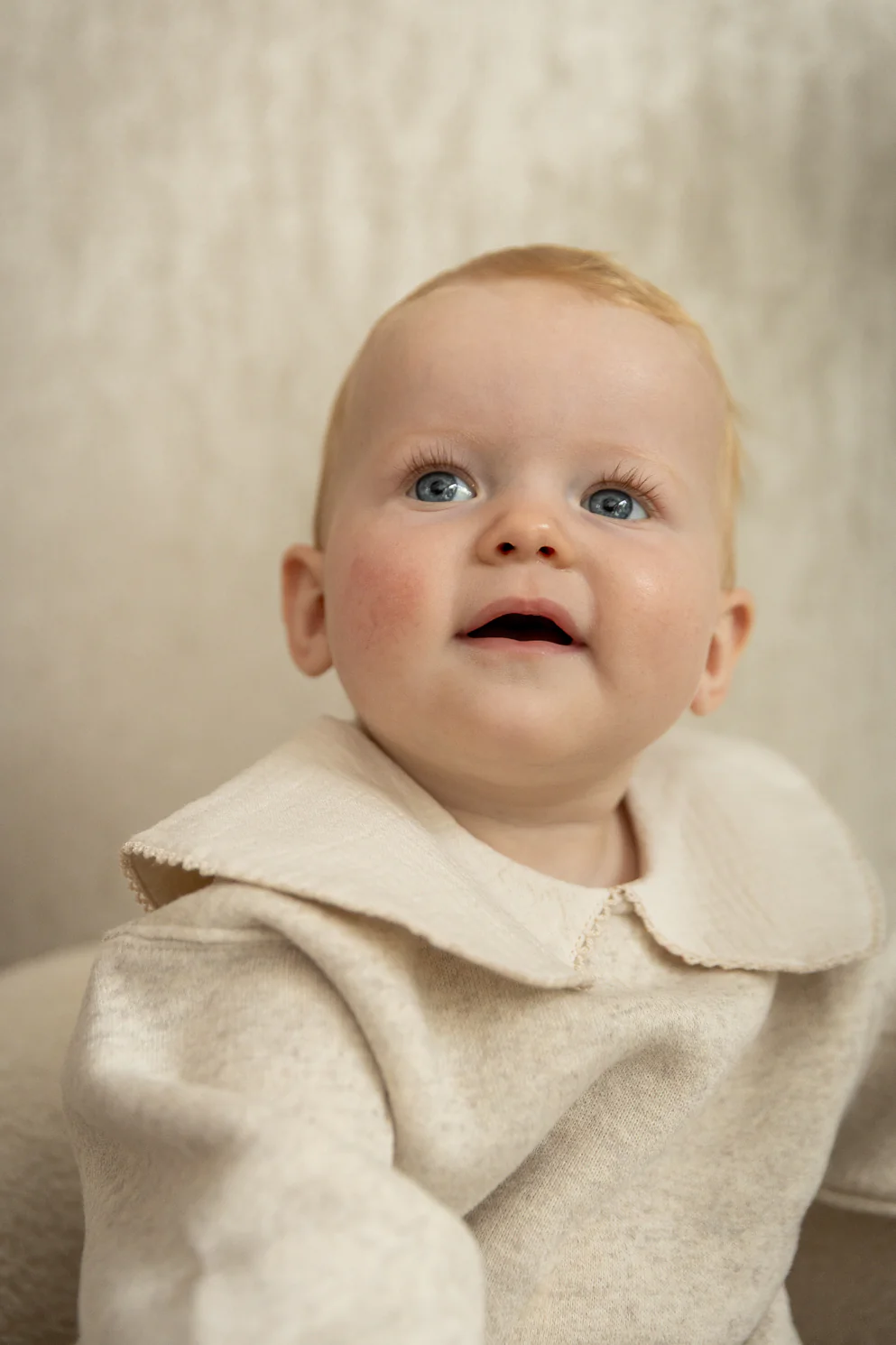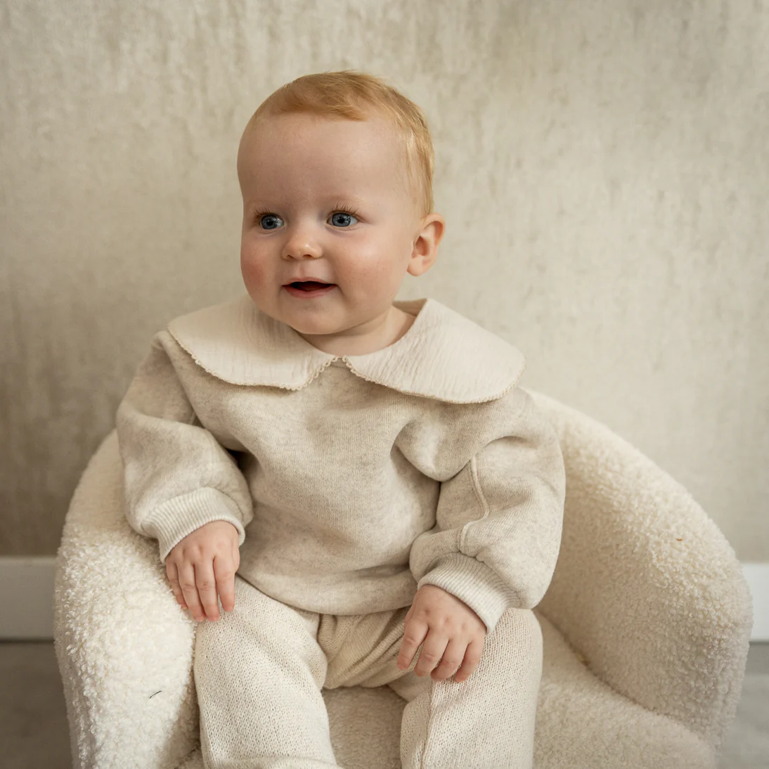 Comfortabele sweater met een heerlijke girly grote kraag. Zo mooi en zo zacht, echt een must-have voor jouw baby meisje. De kleur is ecru, valt als een vergrijsde beige tint. De kraag is net wat lichter.