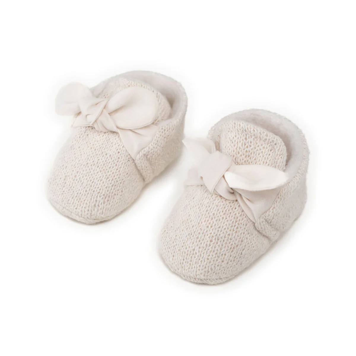 Super schattige baby slofjes. Deze schoentjes zijn gemaakt van mesh met een mix van regeneratief en gerecycled katoen, in de kleur offwhite. De baby booties hebben een fleecevoering en een verstelbare lint die leuk kan strikken.