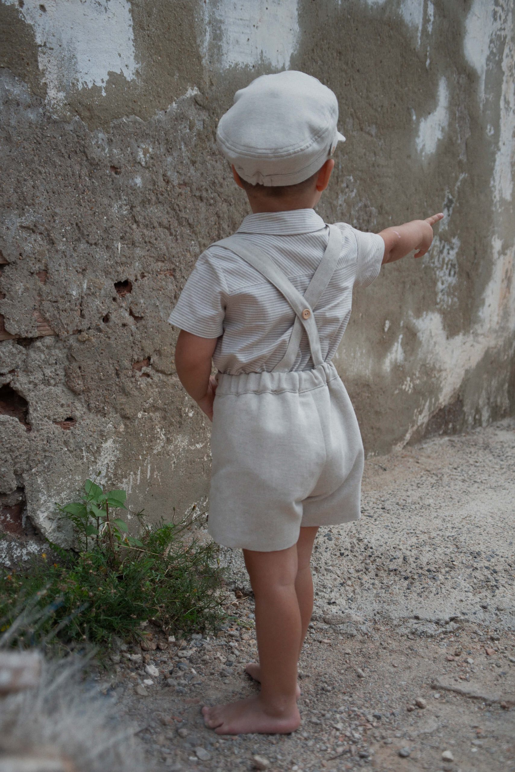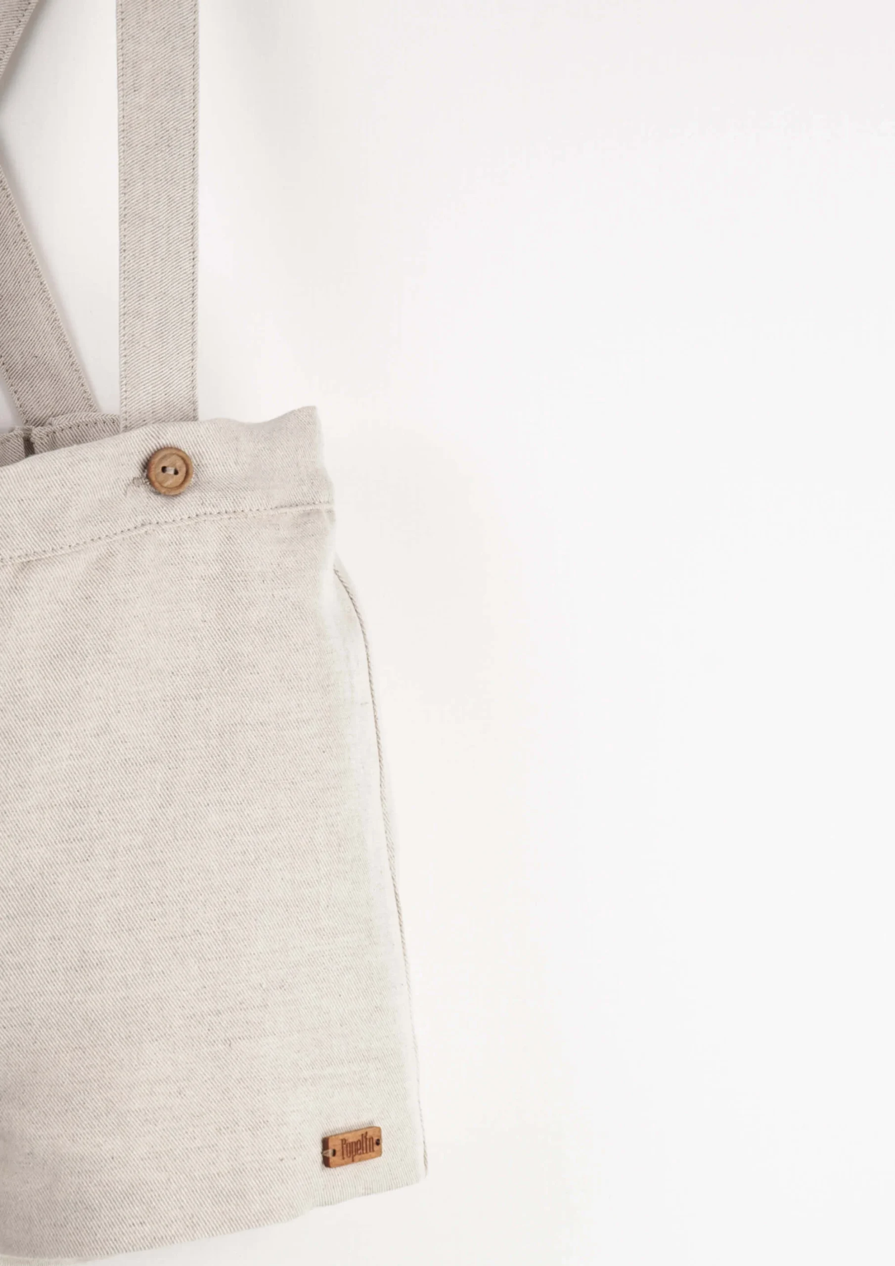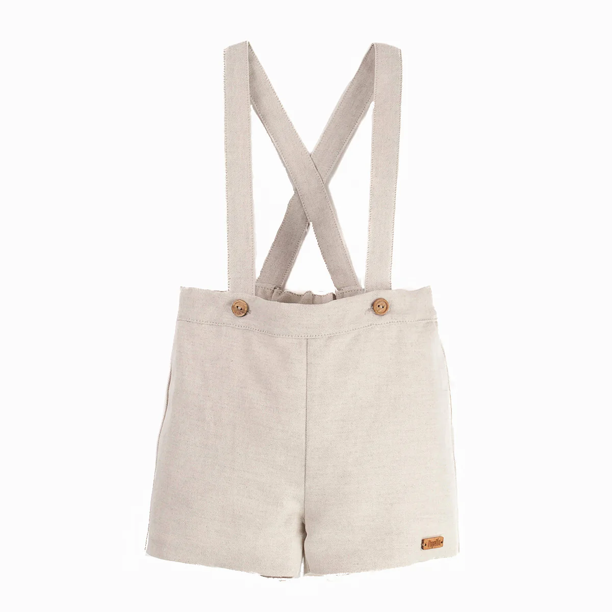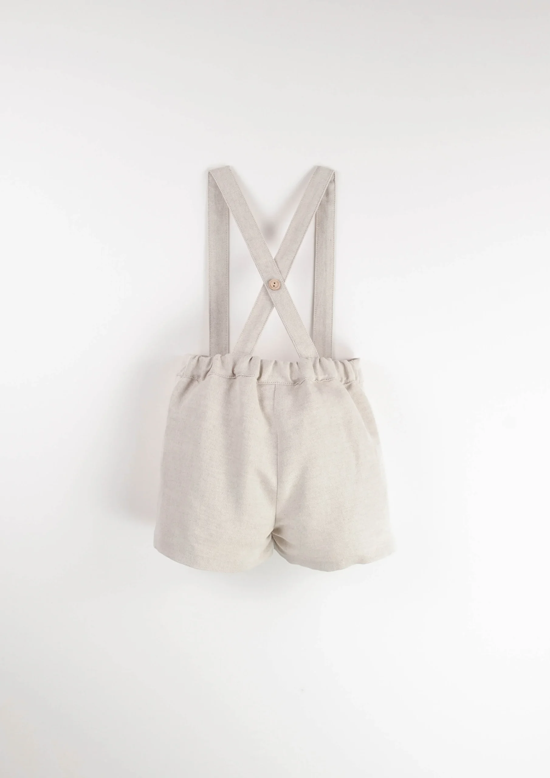 Korte tuinbroek in een prachtige zand kleur. Houten knoopsluiting aan de voorkant. De shorts met bretels zijn van hoge kwaliteit en heel mooi afgewerkt, dit maakt het item erg geschikt voor een feestelijke gelegenheid als een bruiloft.