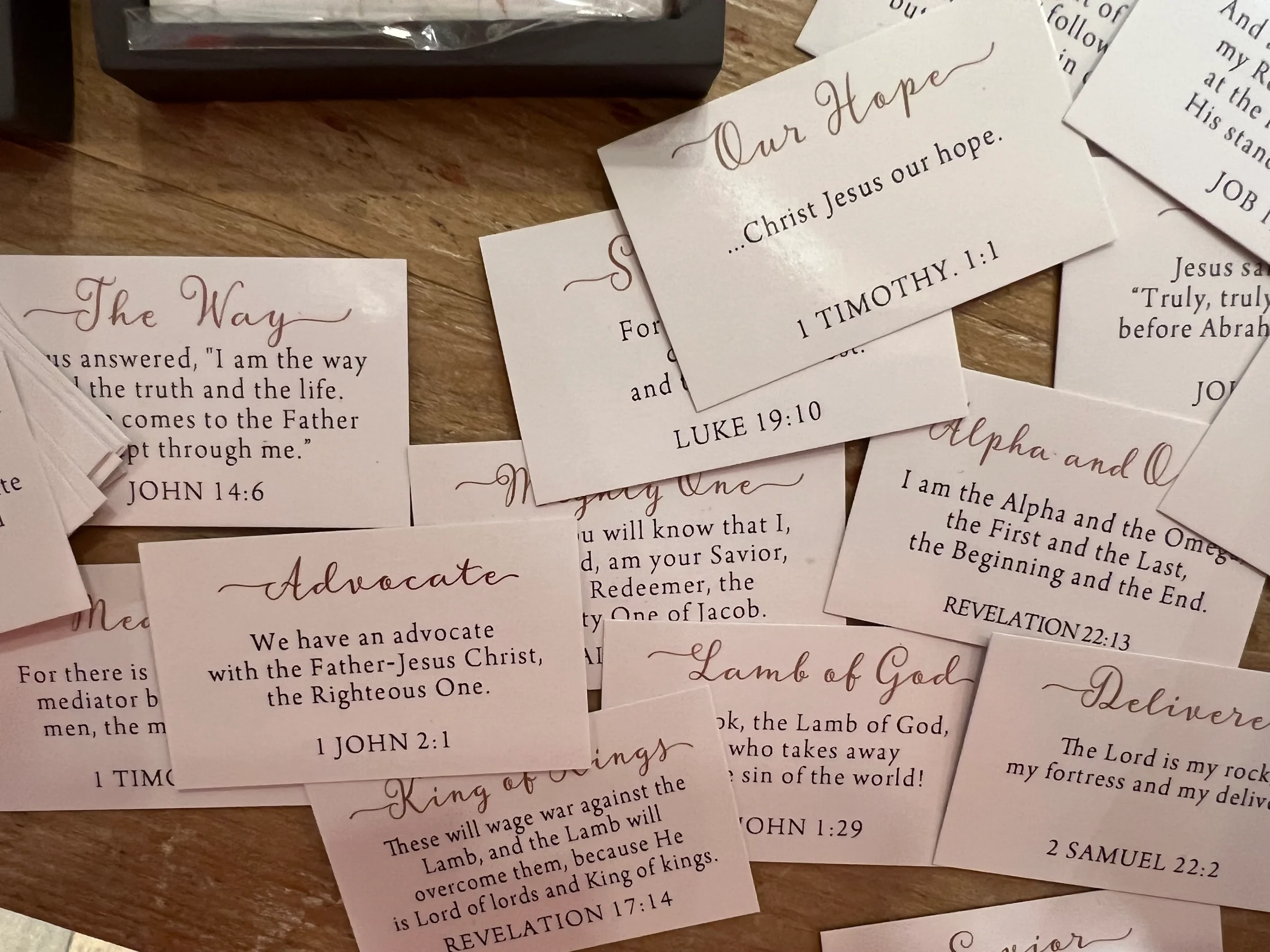 Op elke kaart staat één van de namen bovenaan, en vervolgens het Bijbelvers waarin de naam voorkomt.