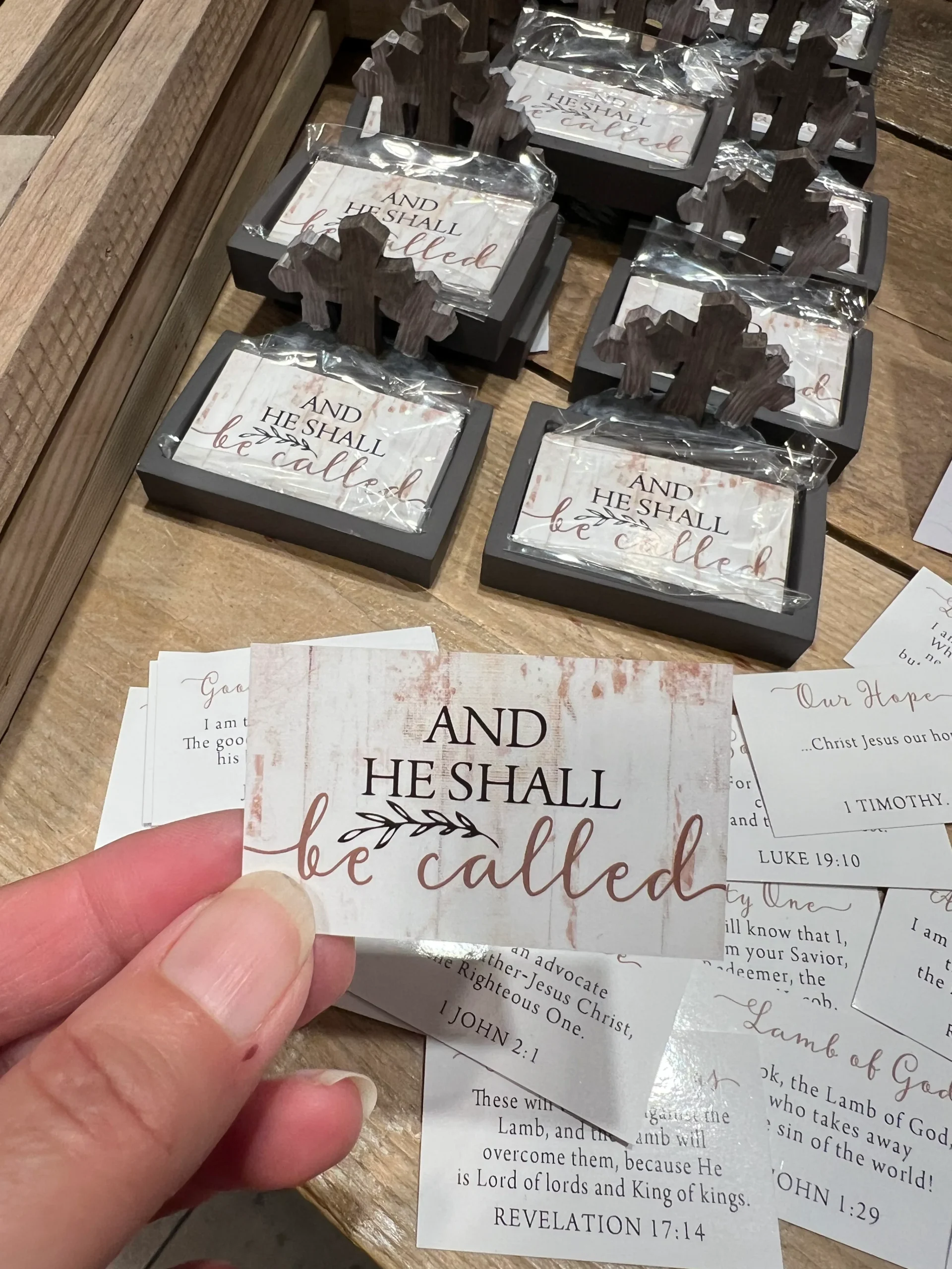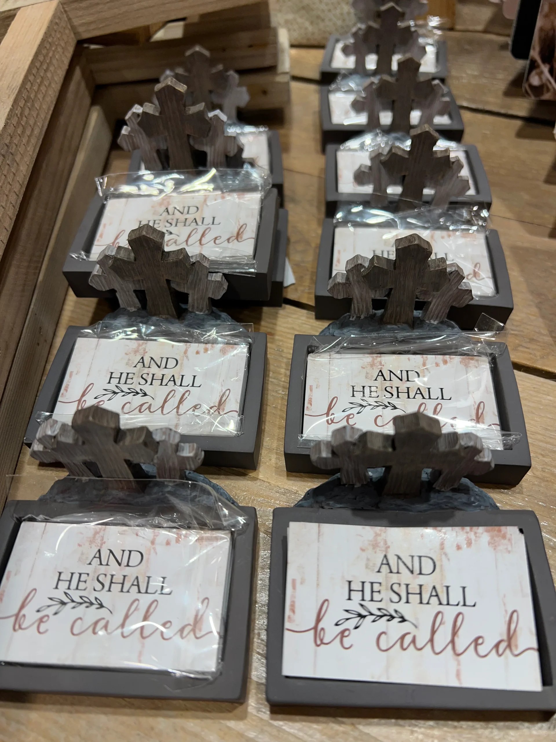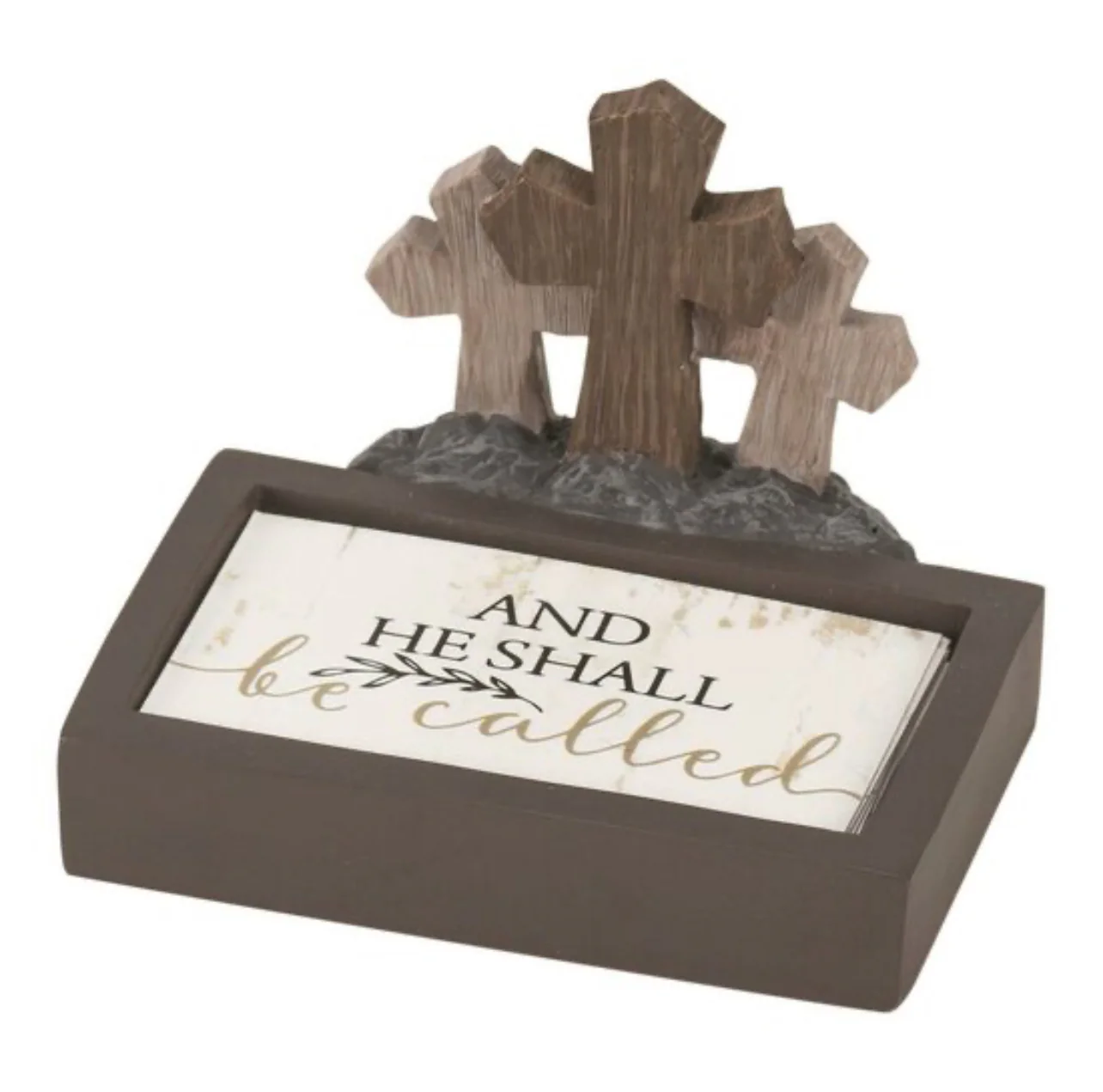 Een prachtig beeldje met 3 kruisjes en een unieke set met kaartjes met 25 namen die in de Bijbel aan Jezus worden gegeven.