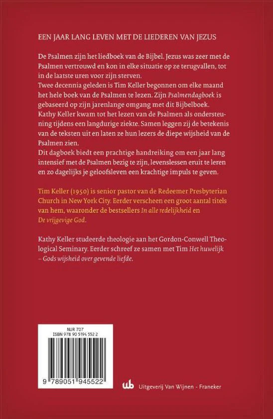 De Psalmen zijn het liedboek van de Bijbel. Jezus was zeer met de Psalmen vertrouwd en kon in elke situatie op ze terugvallen, tot in de laatste uren voor zijn sterven. Twee decennia geleden is Tim Keller begonnen om elke maand het hele boek van de Psalmen te lezen. Zijn Psalmendagboek is gebaseerd op jarenlange omgang met dit Bijbelboek. Kathy Keller kwam tot het lezen van de Psalmen als ondersteuning tijdens een langdurige ziekte. Samen leggen zij de betekenis van de teksten uit en laten ze hun lezers de diepe wijsheid van de Psalmen zien. Dit dagboek biedt een prachtige handreiking om een jaar lang intensief met de Psalmen bezig te zijn, levenslessen eruit te leren en zo dagelijks je geloofsleven een krachtige impuls te geven. Tim Keller (1950) is senior pastor van de Redeemer Presbyterian Church in New York City. Eerder verscheen een groot aantal titels van hem, waaronder de bestsellers ‘In alle redelijkheid’ en ‘De vrijgevige God’. Kathy Keller studeerde theologie aan het Gordon-Conwell Theological Seminary. Ze schreef samen met Tim ‘Het huwelijk – Gods wijsheid over gevende liefde’.