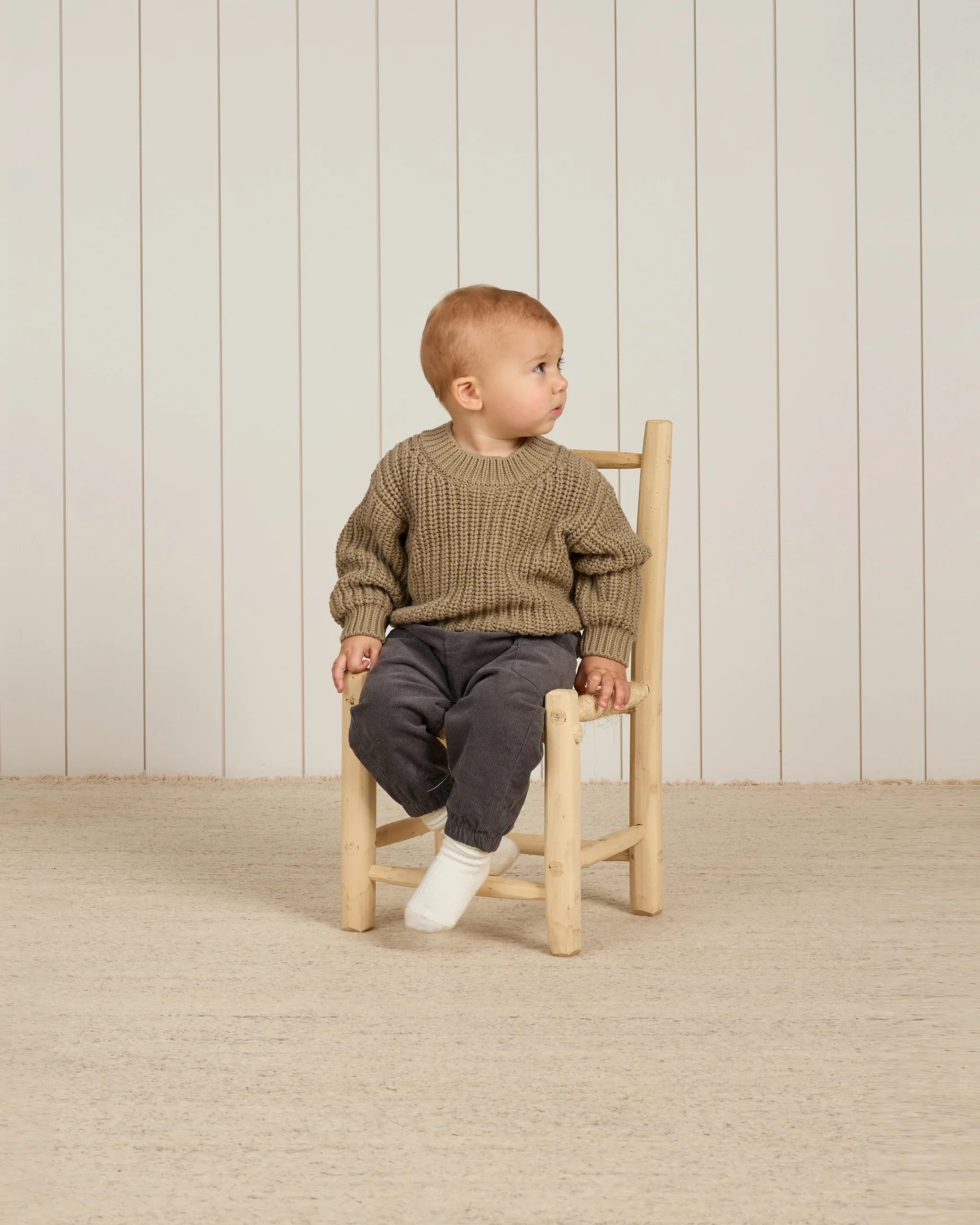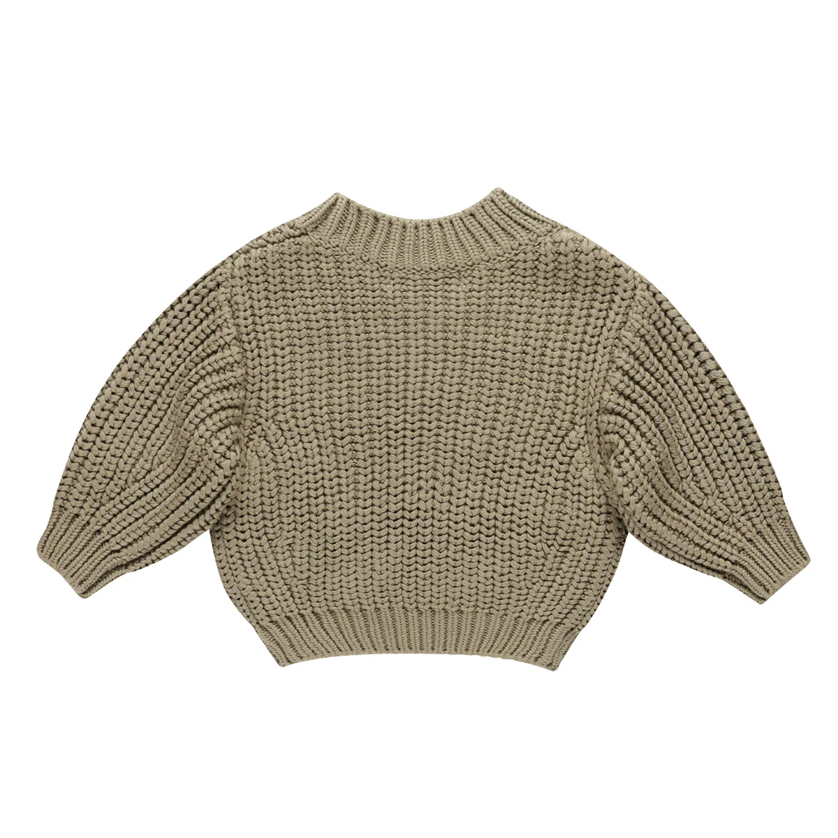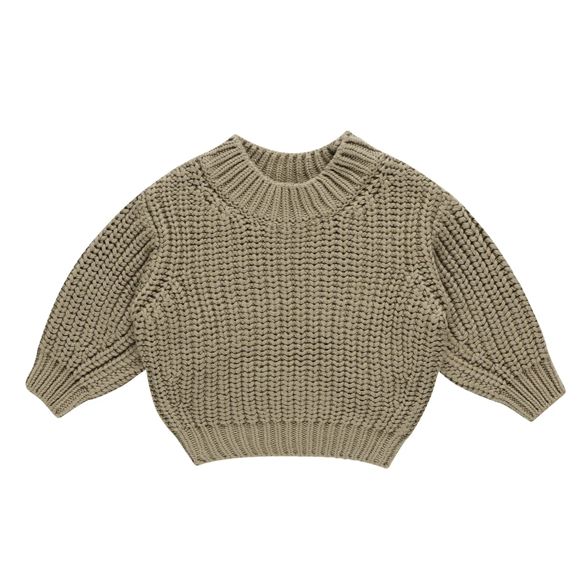 Grof gebreide trui met rib boorden bij de mouw- en halsopeningen. Dit model van Quincy Mae valt wat oversized. De warme olijfgroene kleur is een prachtige herfst/winter tint.