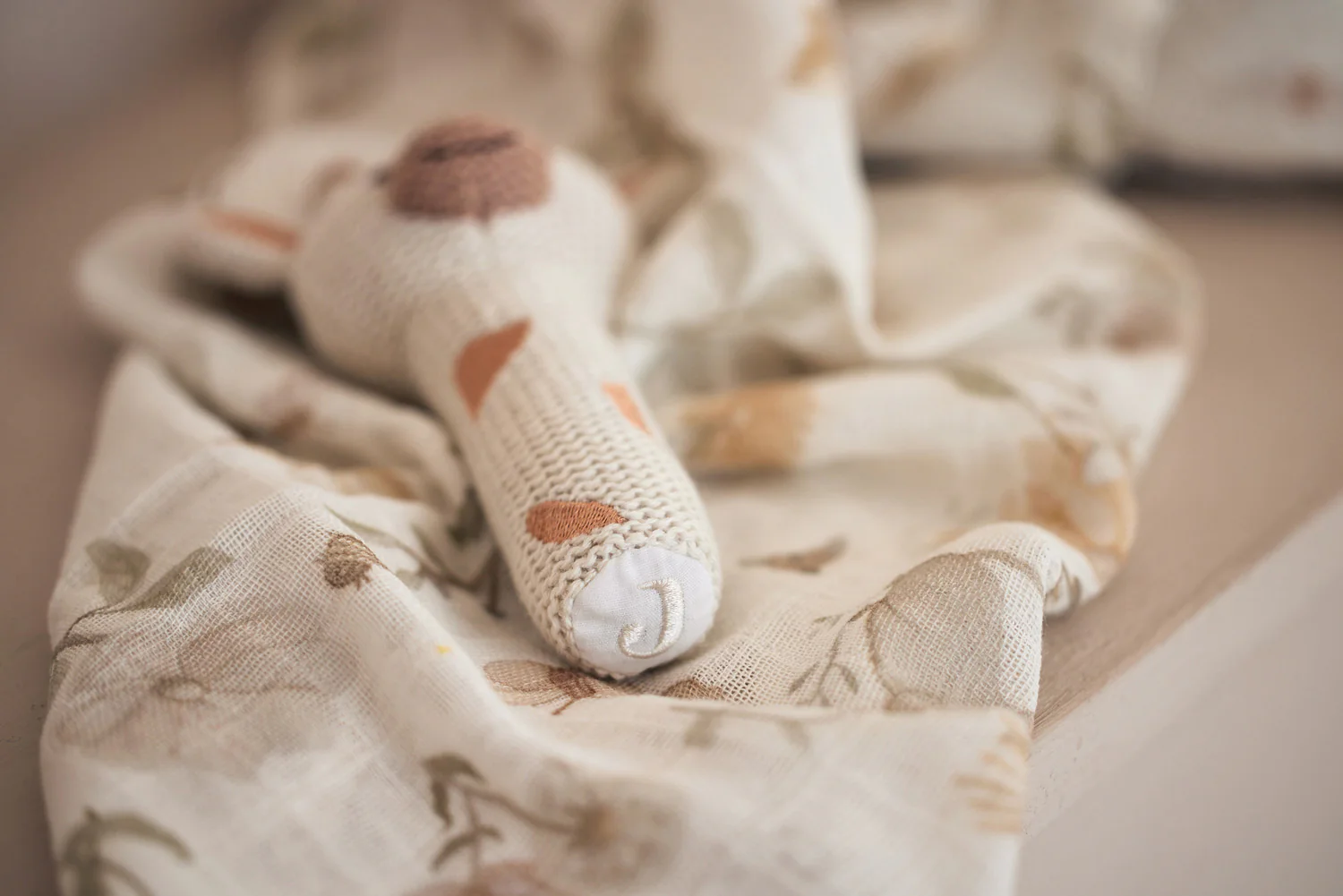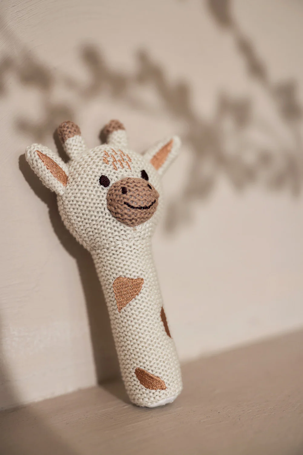 Rammel er op los met dit leuke gebreide rammelaartje. Het schattige giraffe gezichtje heeft meteen een grote aantrekkingskracht op jouw mini! In het rammelaartje zitten subtiele belletjes verwerkt zodat je kleintje er uren speelplezier van heeft. We hebben ook een vos en beer rammelaar in ons assortiment.