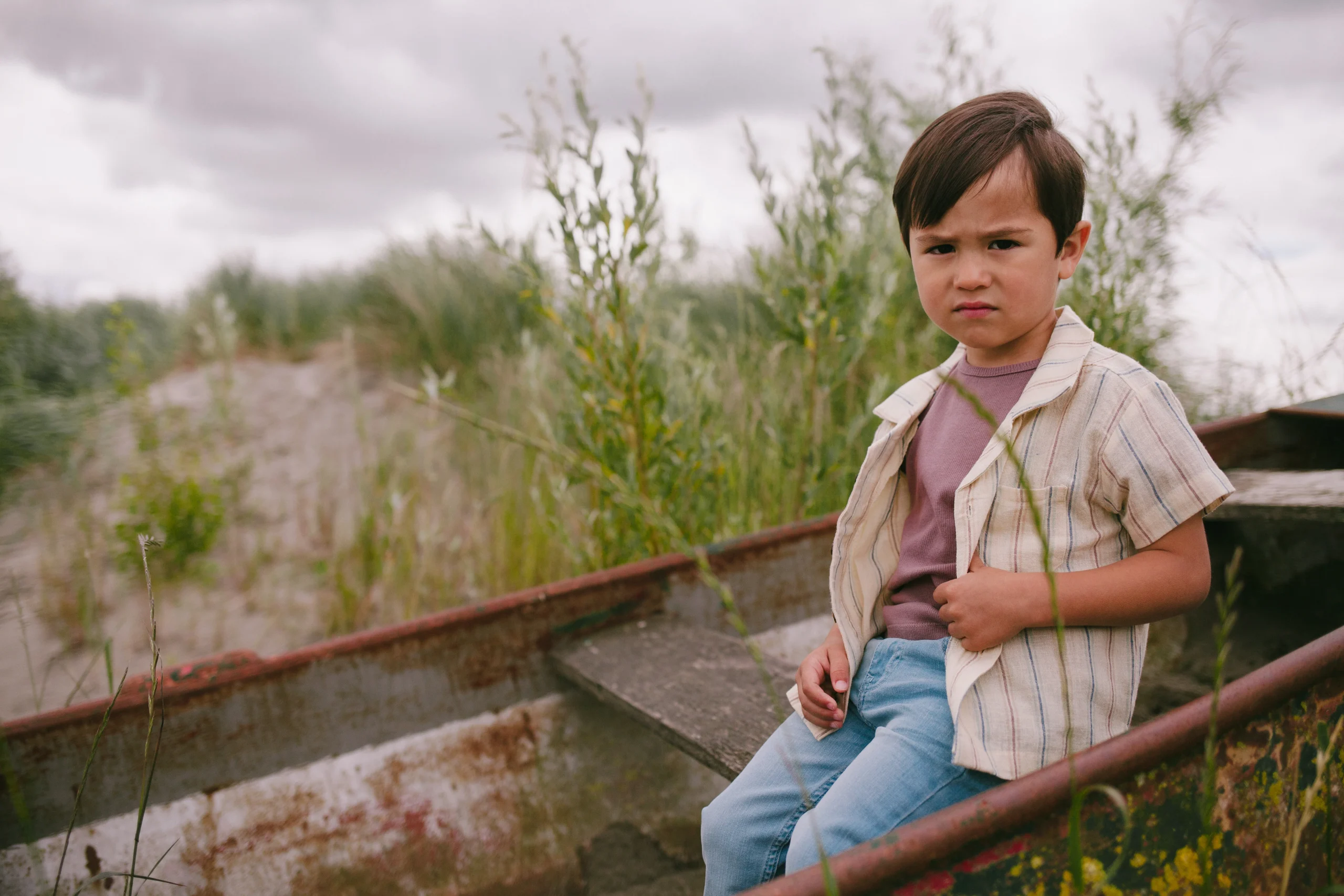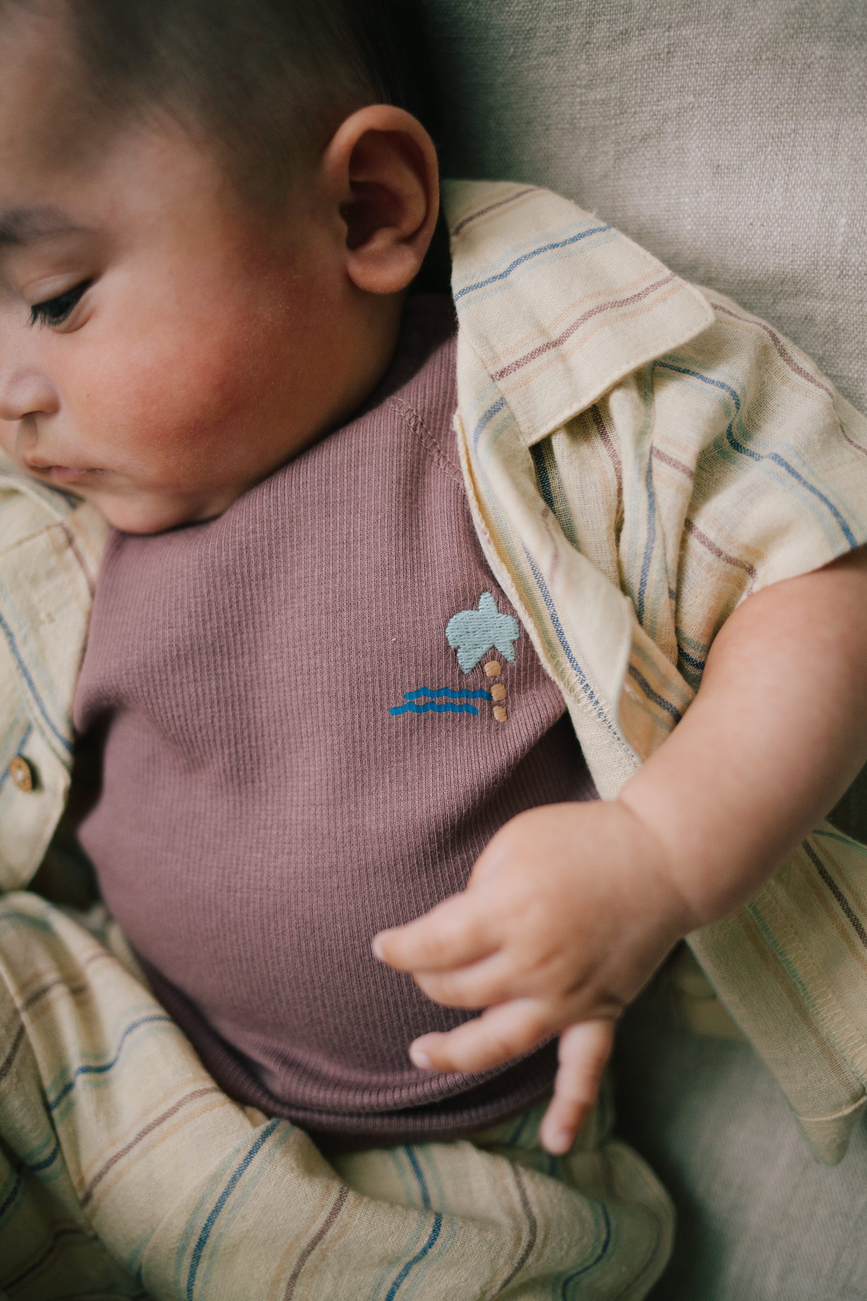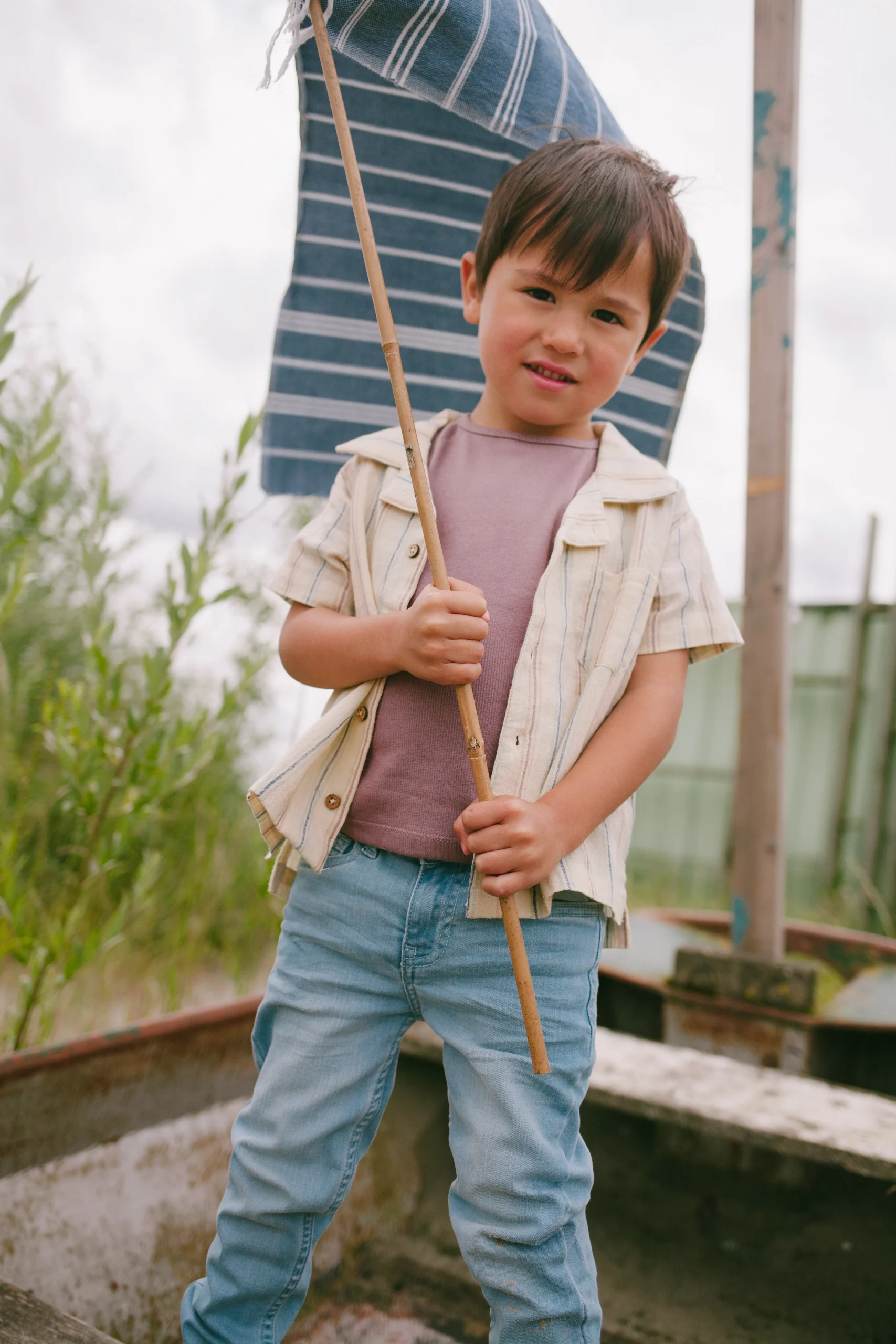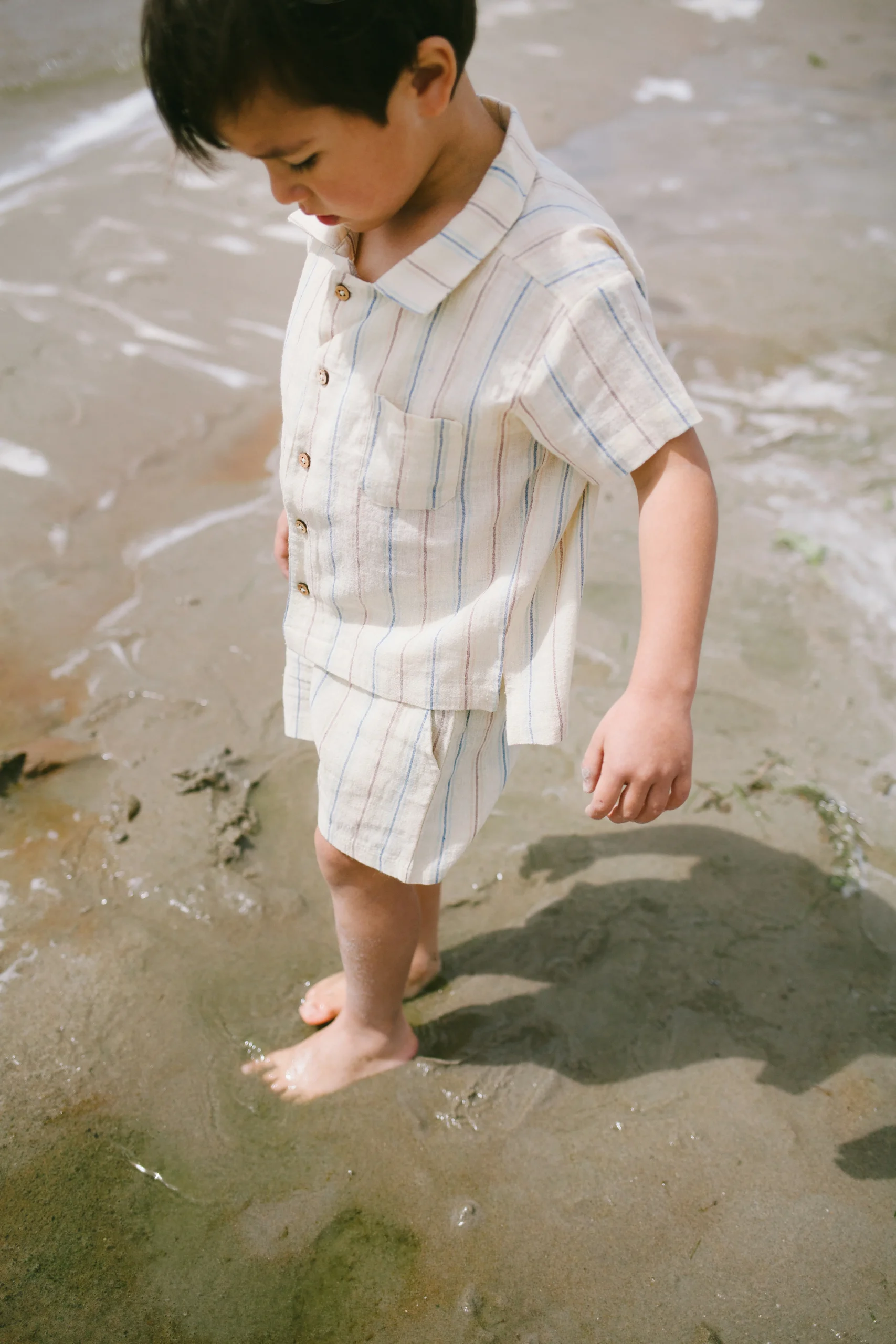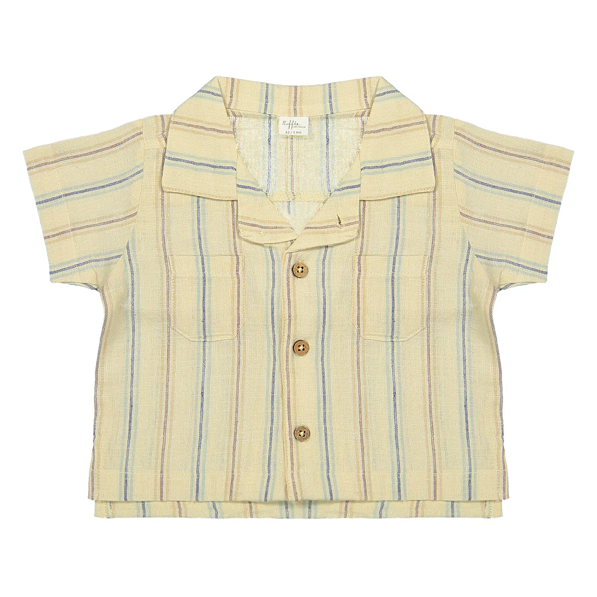 Luchtige katoenlinnen blouse van Riffle Amsterdam. Blouse Cody heeft een gestreept patroon (blauw, paars en rood) op een ecru ondergrond. De blouse is zowel open als dicht te dragen en creëert op deze manier diverse jongen outfits.
