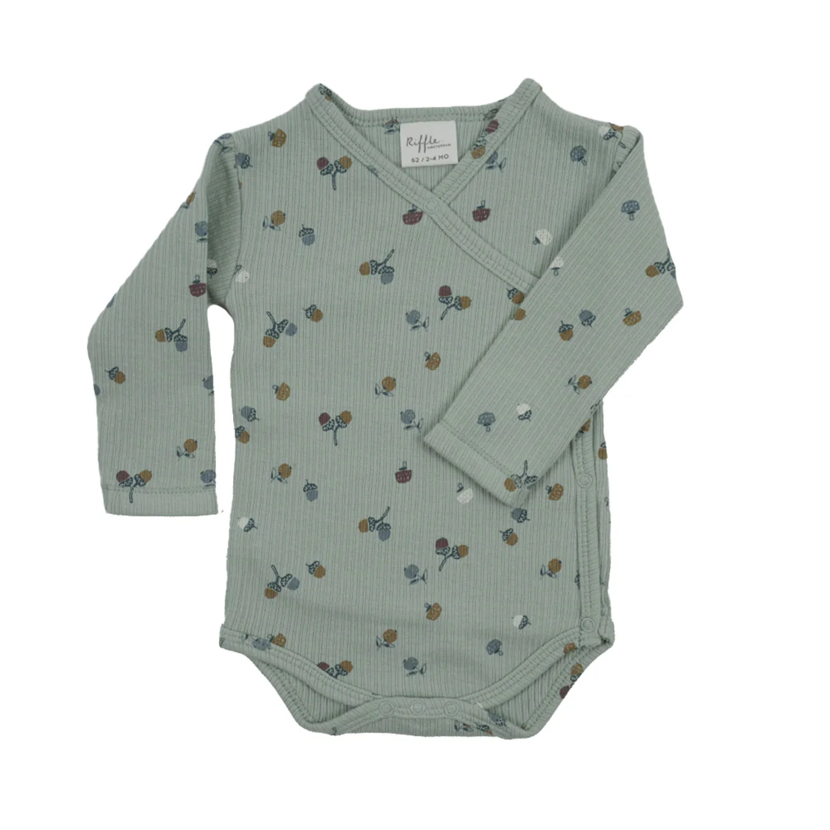 Een romper in herfst thema. De romper heeft een zacht groene kleur met een printje van eikels, paddestoelen en bessen. Deze romper combineert mooi met een legging/broekje in de kleur caramel of bruin.