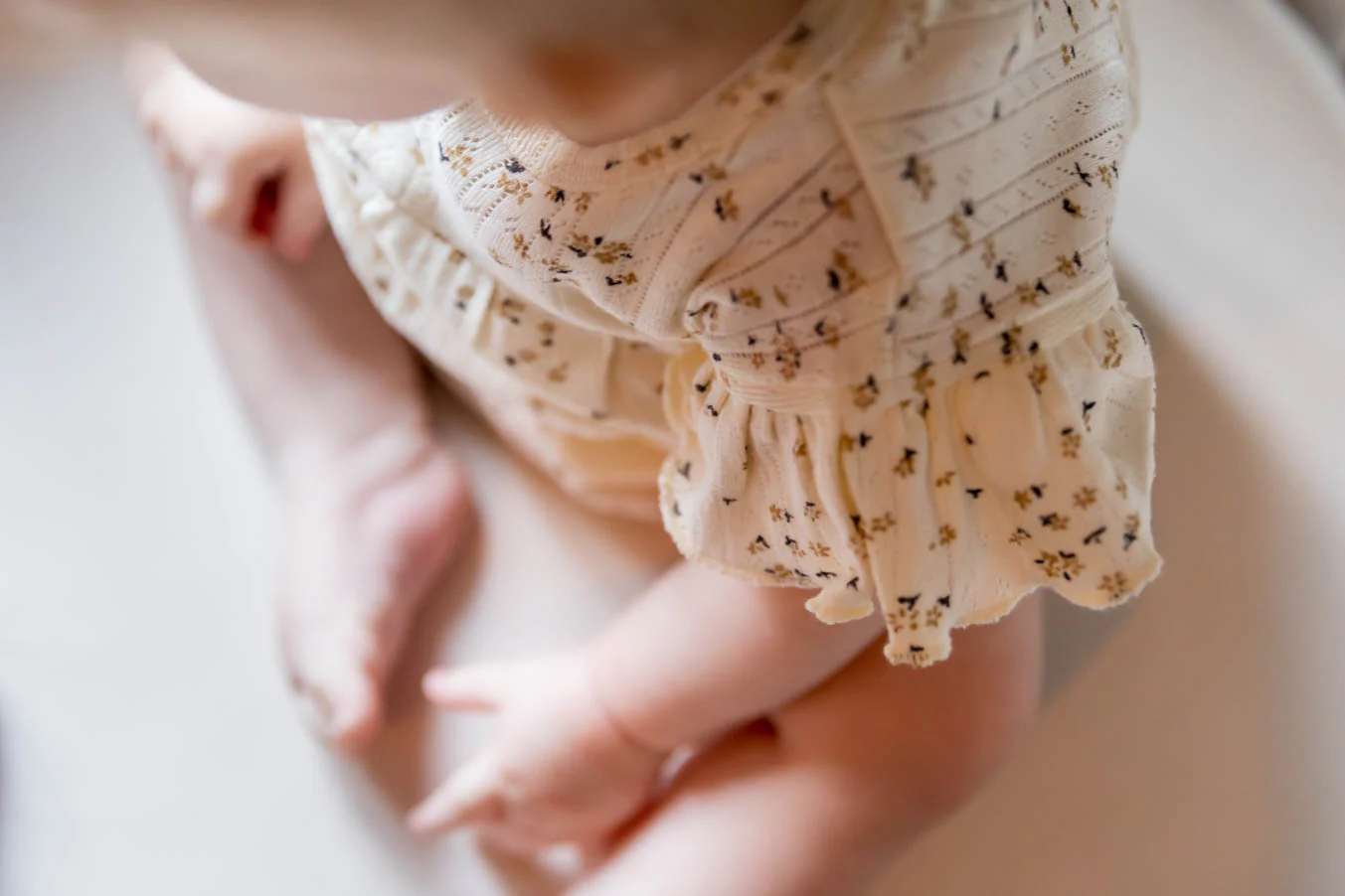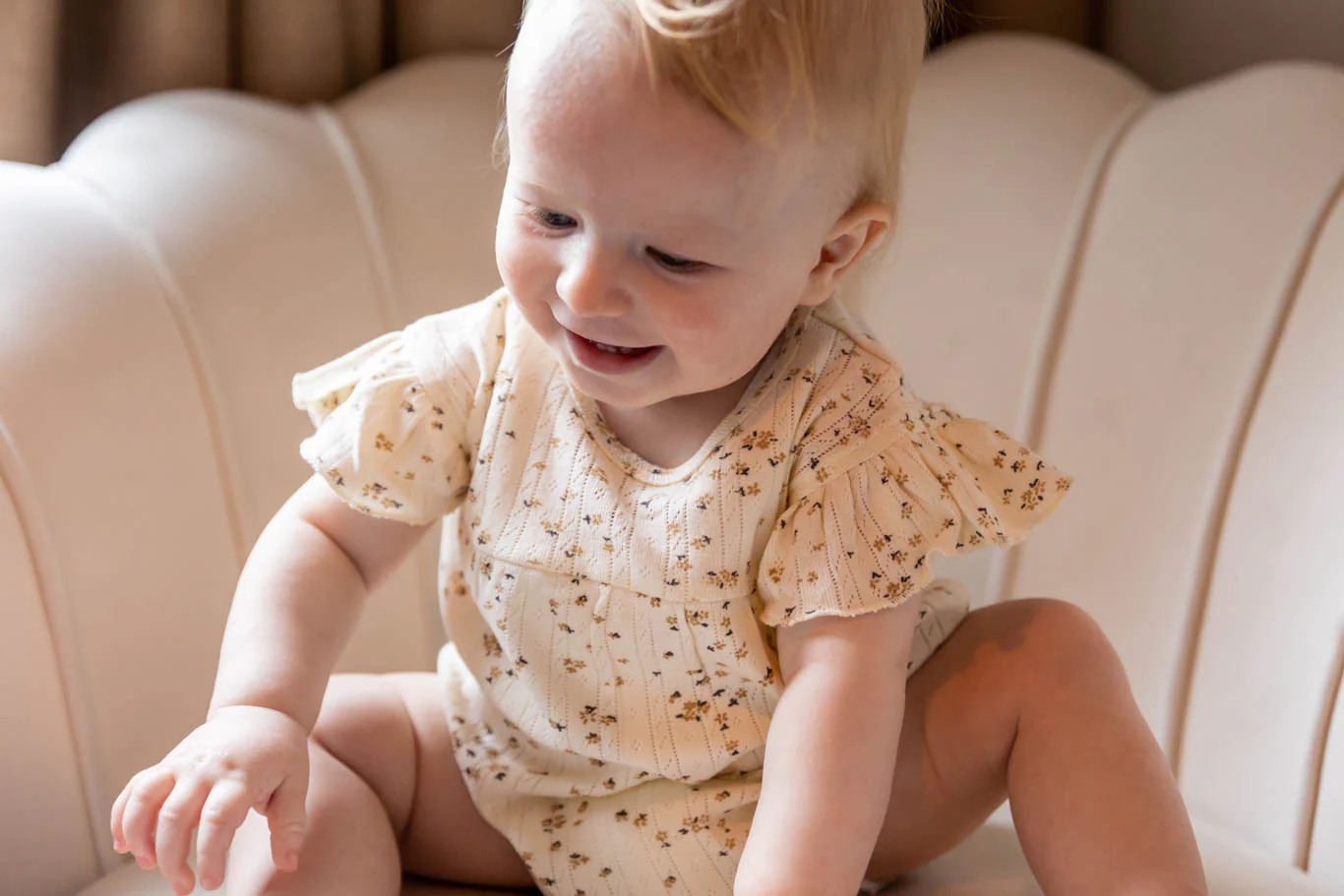 Deze gebloemde romper van Riffle Amsterdam heeft net dat beetje extra. Ruches bij de schouders en een mooie belijning op borsthoogte. De romper heeft knopen bij de hals voor het gemakkelijk aankleden en heeft drukknopen aan de onderkant voor het gemakkelijk verschonen.