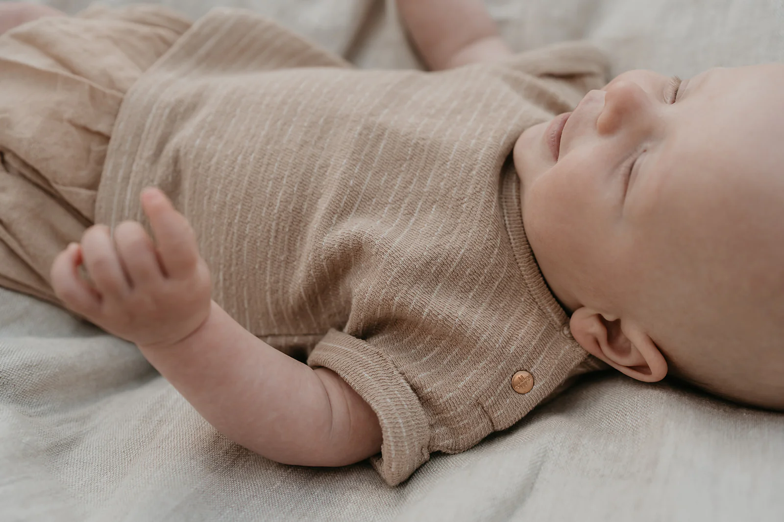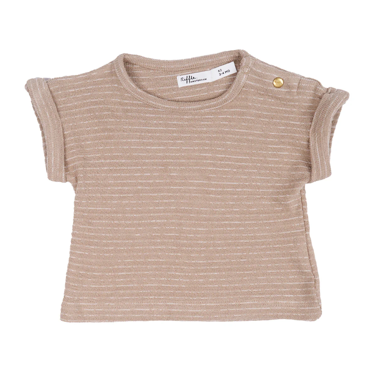 Een T-shirt met stijlvolle omgeslagen mouwen en een brede zoom aan de onderkant. Het shirt heeft een tijdloze beige/offwhite gestreept patroon. Om makkelijk aan en uit te kleden heeft het T-shirt een drukknoop bij de hals.