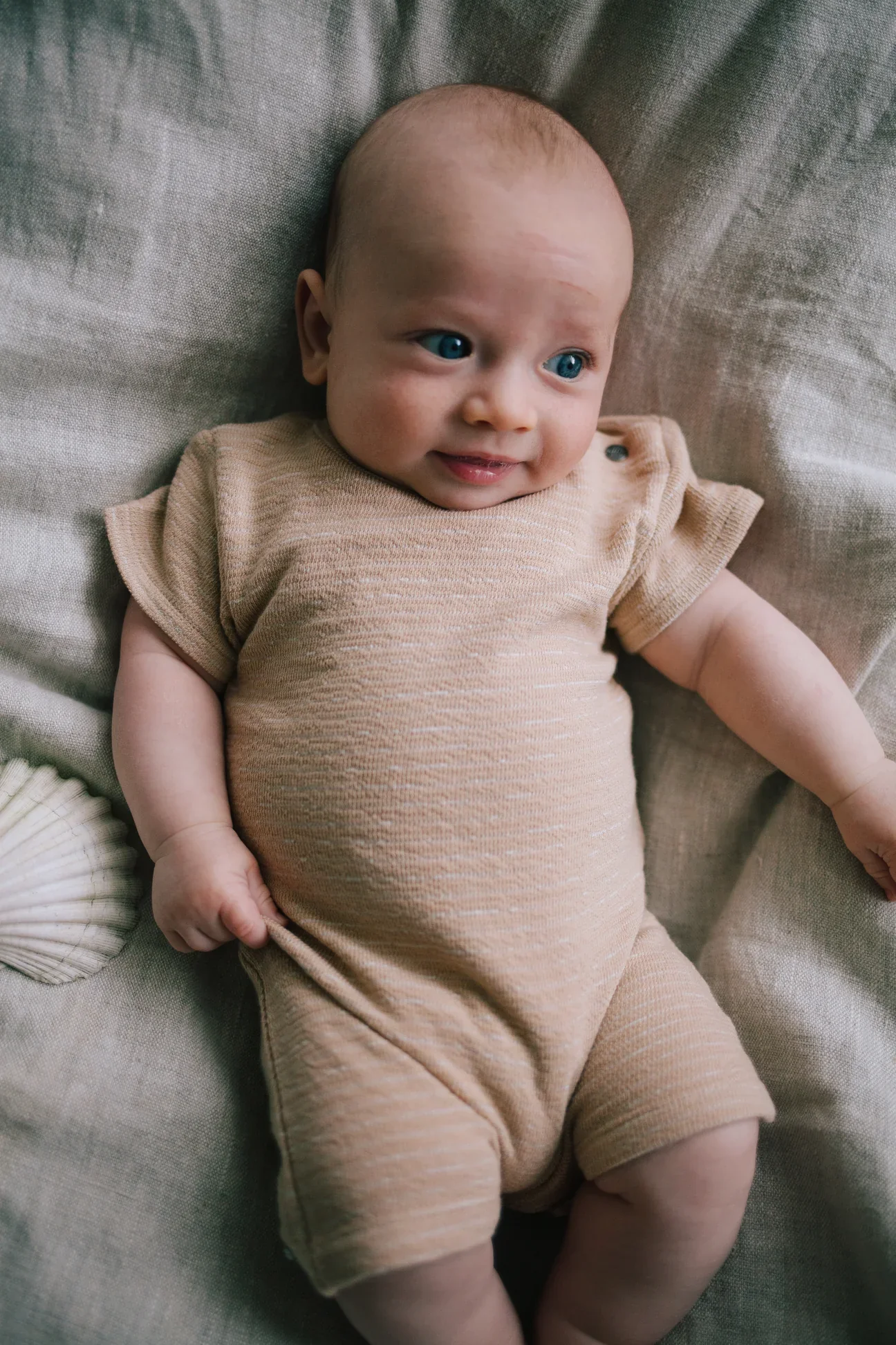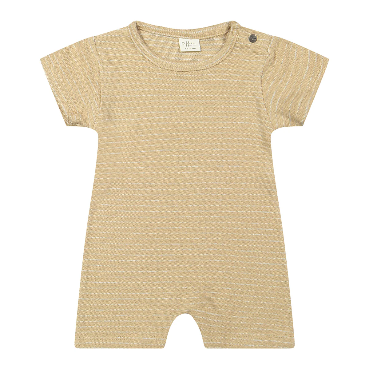 Fijn badstof pakje voor jouw zomer baby. Beige gestreept patroon. Het zomerse suit is van terry materiaal. Het is geen heftige badstof, lijkt meer op een wat vollere katoenen stof.