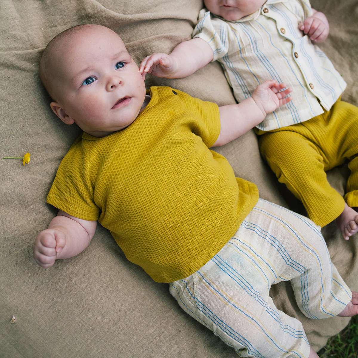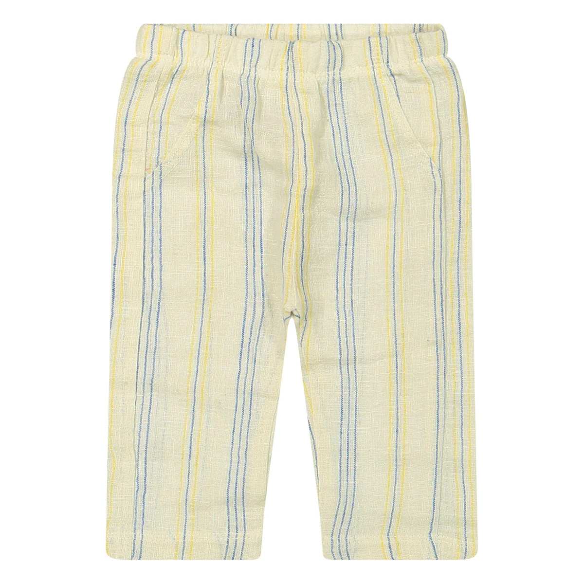 Luchtige katoenlinnen zomer broek. De basis kleur van deze broek is ecru en het heeft blauwe en gele streepjes.
