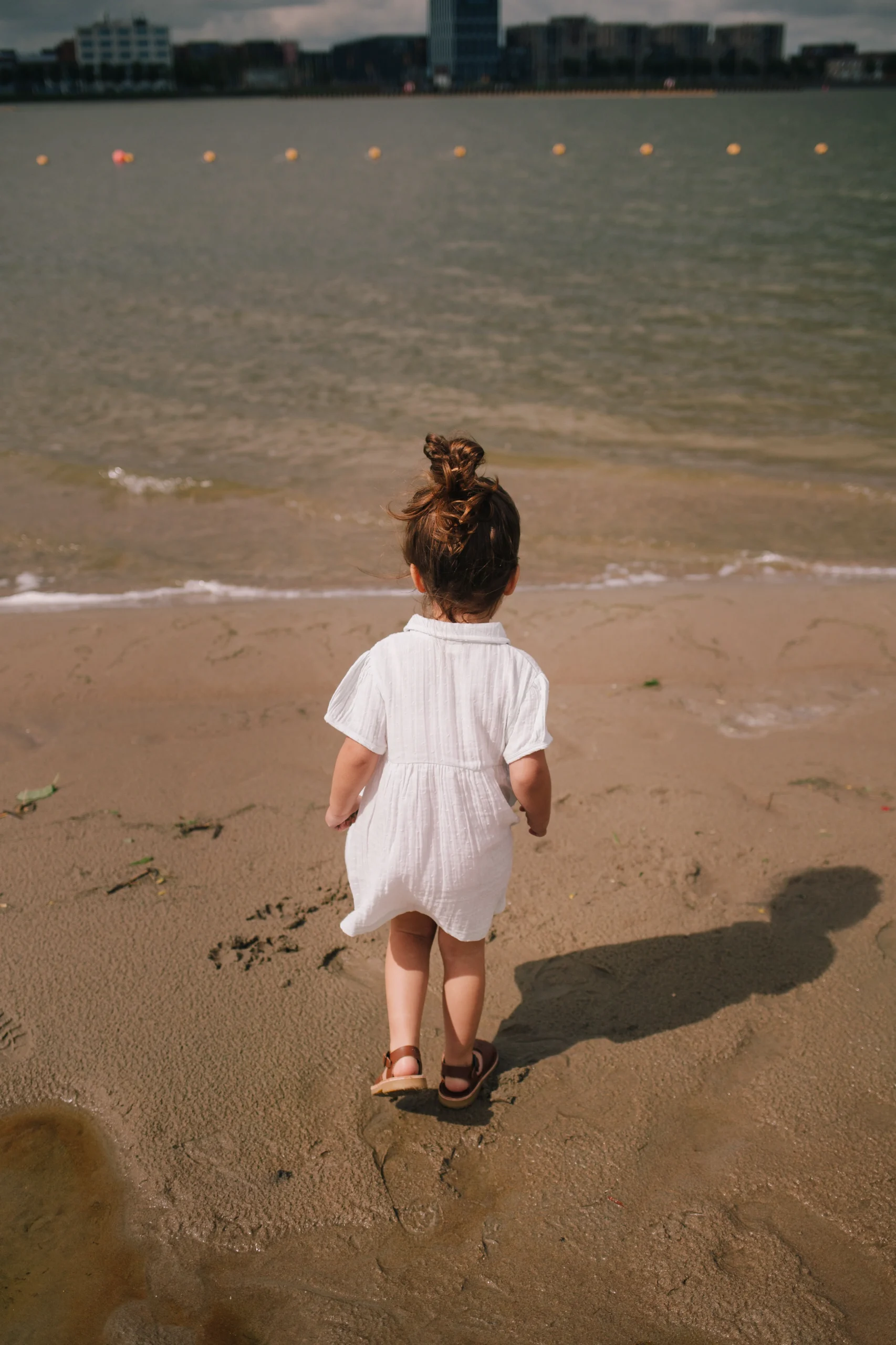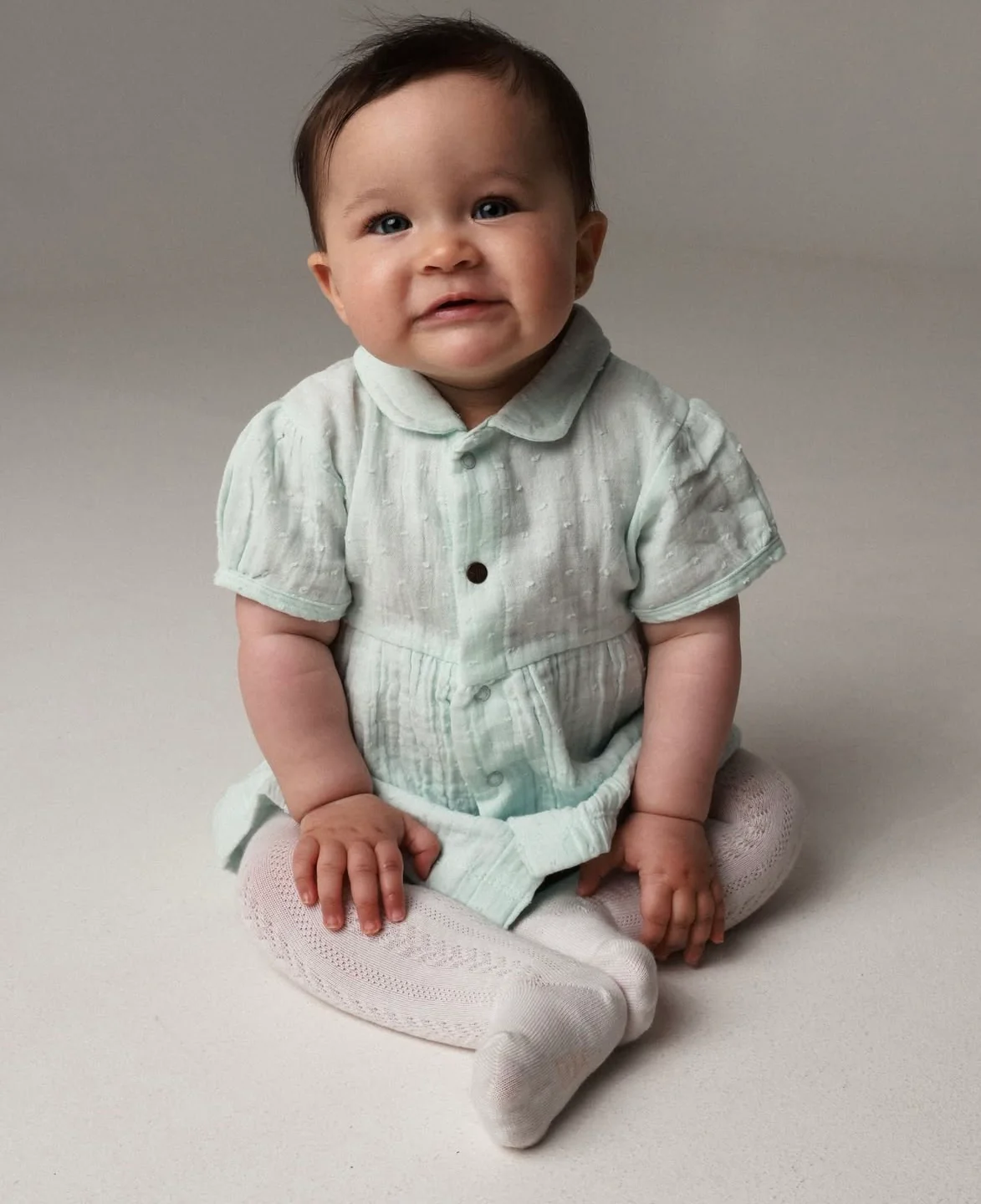 Geweven katoenen jurk Audrey van Riffle Amsterdam. De kleur is heel licht blauw. De kleur klopt op de eerste lifestyle foto. Op de laatste twee foto’s is het wel het jusite model, maar het jurkje is blauwer geworden in de eindproductie.