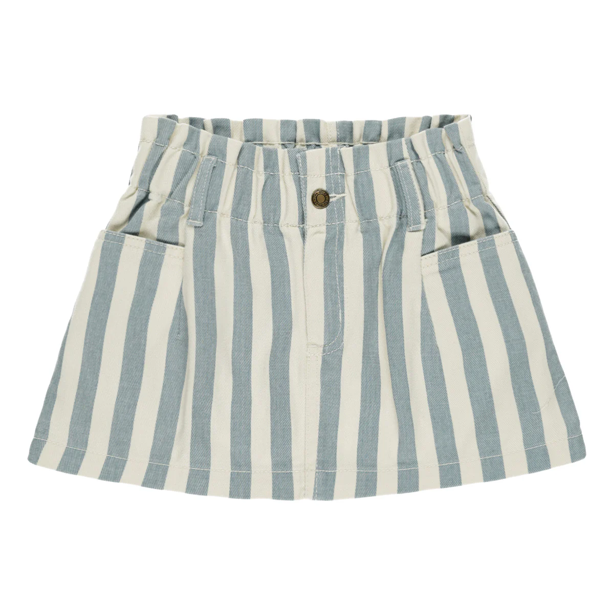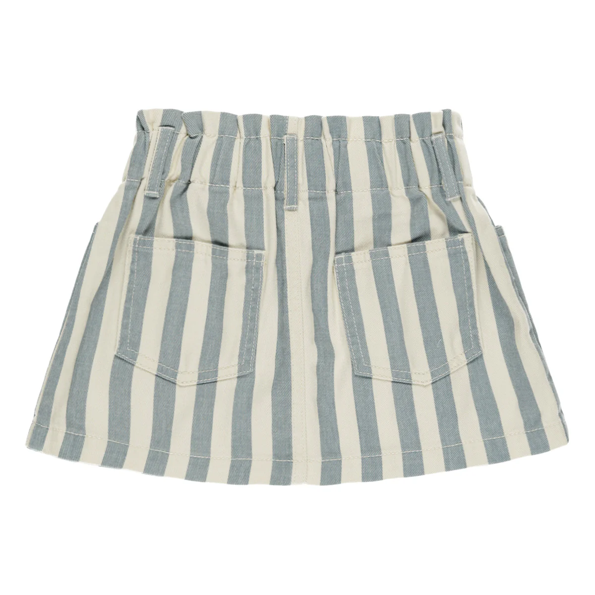 Fashionable denim mini rok van Rylee + Cru. Het streeppatroon is breed, verticaal en lichtblauw. De rok heeft zakken aan zowel de voorkant als de achterkant.