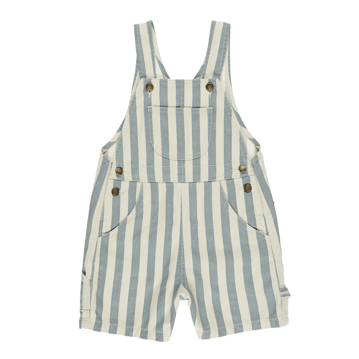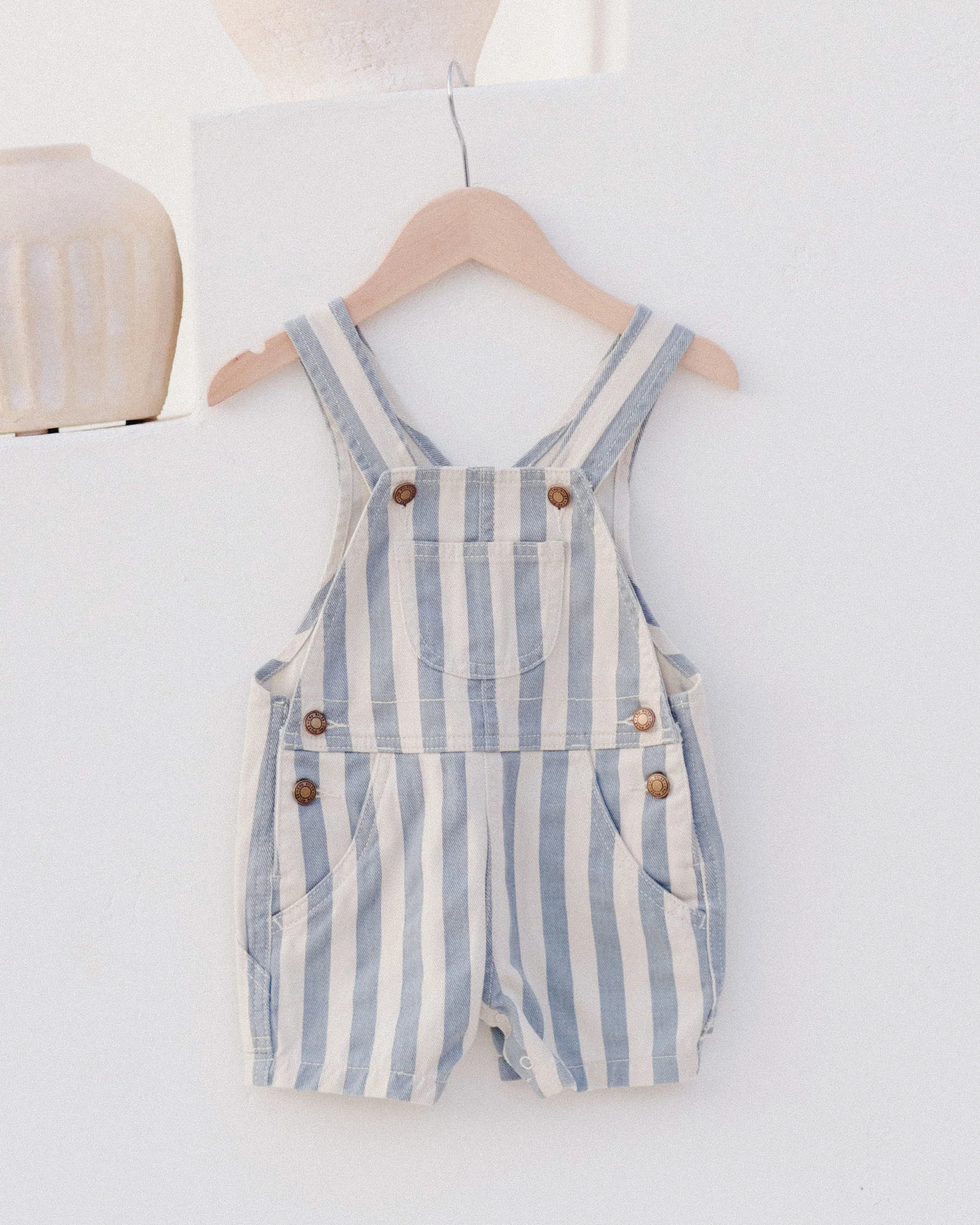 Heerlijke denim shortalls van Rylee + Cru. Deze tuinbroek is een echte zomerklassieker. Het streeppatroon is breed, verticaal en lichtblauw.
