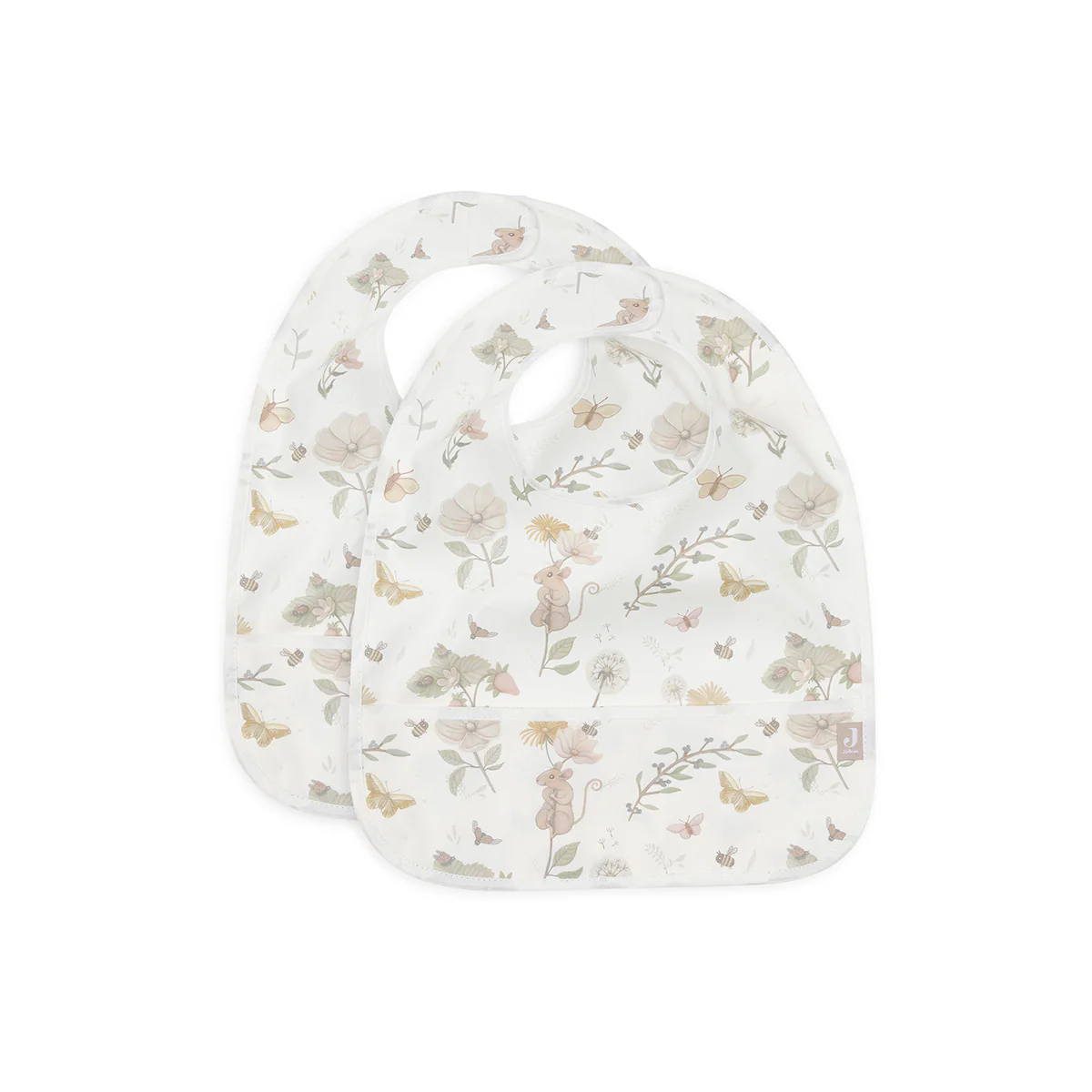 Een handige twee pack met waterproof slabben. Dit set komt uit de serie ‘Dreamy Mouse van Jollein, en dromerig is dit printje wel. De waterproof slabbetjes doorstaan zelfs de ergste knoeipartijen van jouw ontdekkende baby of dreumes. Maak het slabbetje gemakkelijk vast met het zachte klittenband in het nekje van je kleintje en neem de slab na gebruik af. Deze Dreamy Mouse slab is ook beschikbaar met lange mouwen.