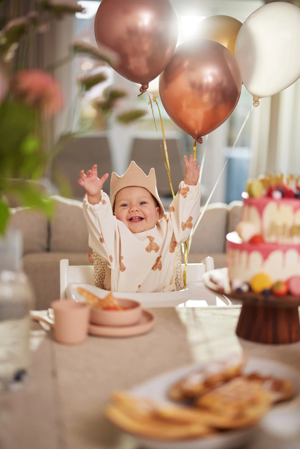 Deze mooie slab is waterproof, afneembaar en heeft lange mouwen. Leren eten gaat nou eenmaal niet vlekkeloos. Of misschien toch wel dankzij deze slab?!