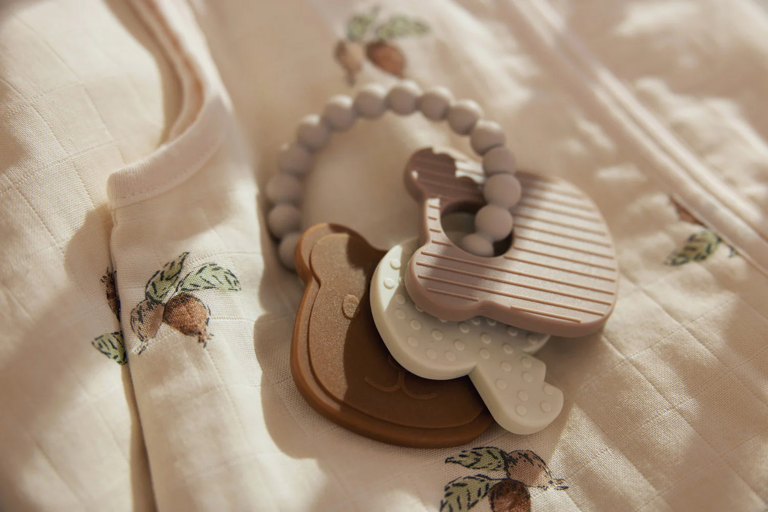 Deze siliconen bijtring met neutrale kleuren is een perfect speeltje voor kleintjes die graag dingen in hun mond stoppen. Ook erg geschikt voor kindjes die last hebben van beginnende tandjes. Het is dan erg fijn voor je kleintje om ergens op te kunnen bijten. De bolletjes van de sleutelbosring werken verlichtend voor beginnende tandjes. De siliconen sleutelbos bevat twee lieve teddy beer hoofdjes, waarvan een berenhoofdje een lief 3D gezichtje heeft. Het andere beertje heeft strepen en de sleutel bevat ook bolletjes. Ideaal voor thuis of onderweg! Met de siliconenringen maak je de deze leuke bijtring gemakkelijk vast aan de kinderwagen of autostoel.