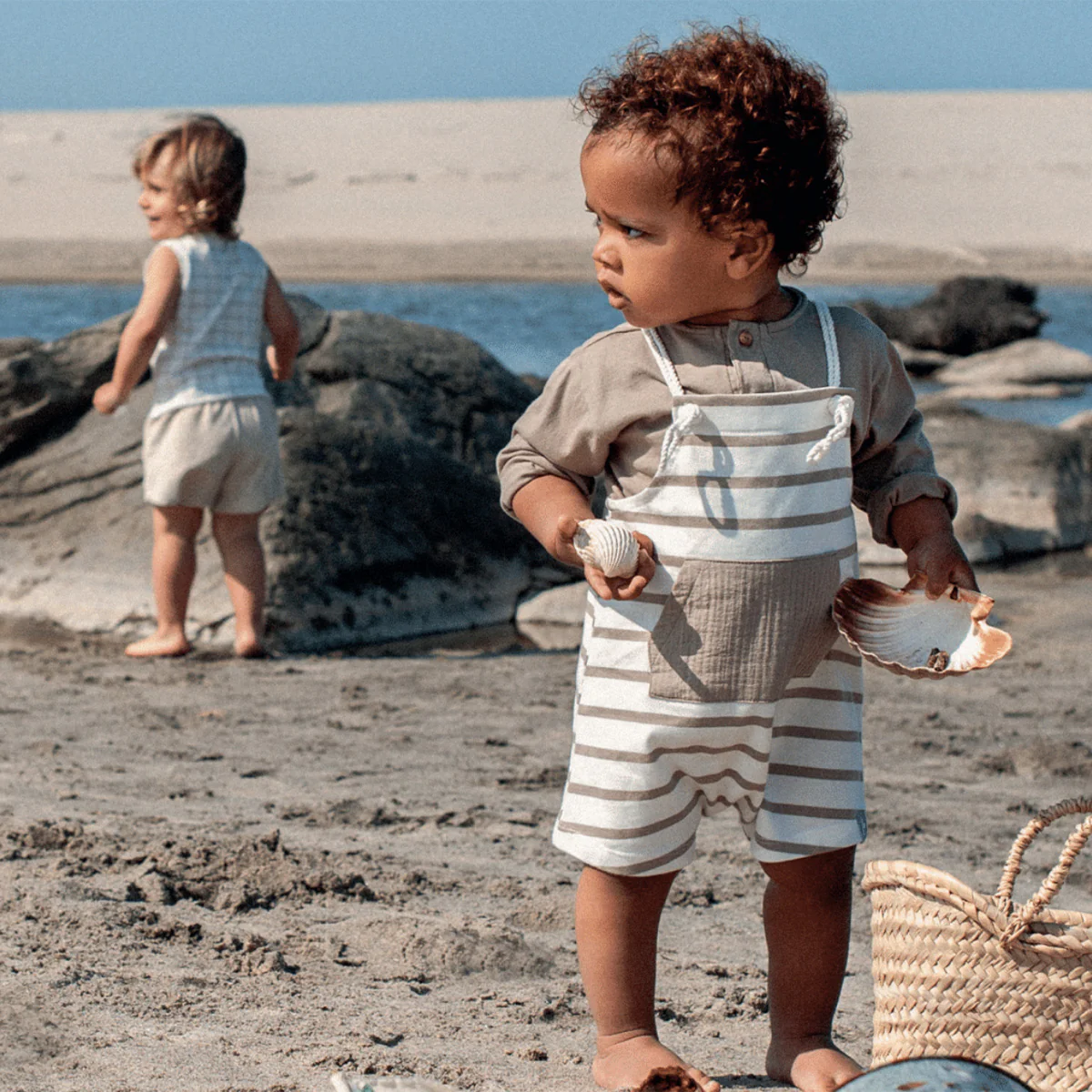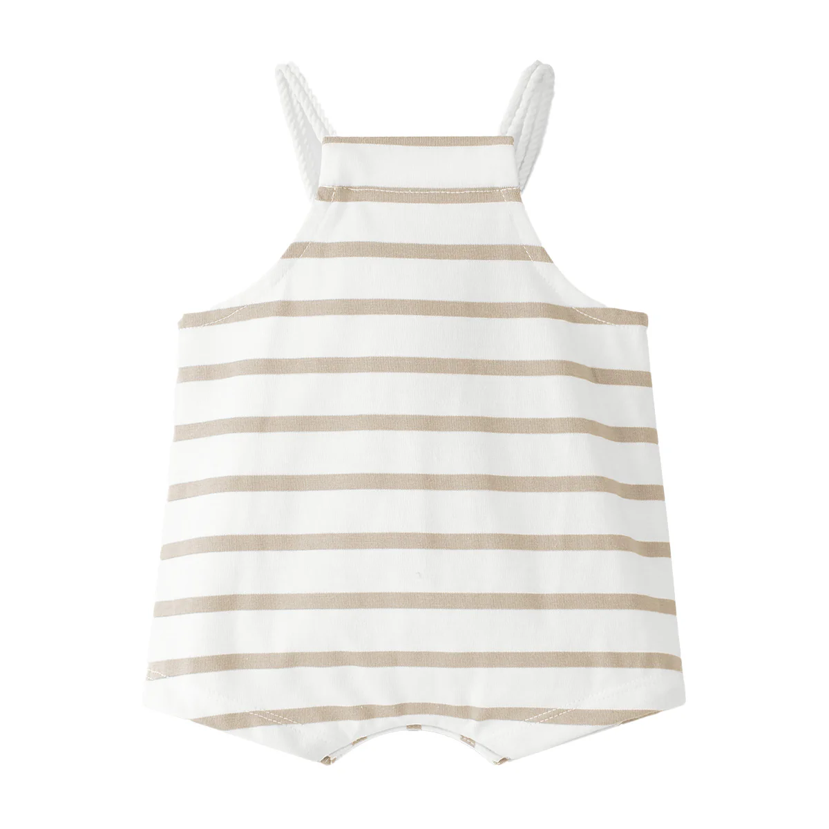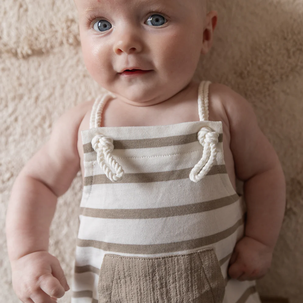 Gestreept tuinbroekje voor jongens. Kleuren offwhite/taupe. De zak midden voor heeft dezelfde kleur taupe als de strepen. Prachtig katoenen materiaal en mooi afgewerkt. Dit tuinbroekje met strepen heeft heerlijk zomerse look. Dankzij de bretels van touwtjes kan de maat nog wat afgesteld worden. De tuinbroek sluit aan de onderkant met drukknopen.
