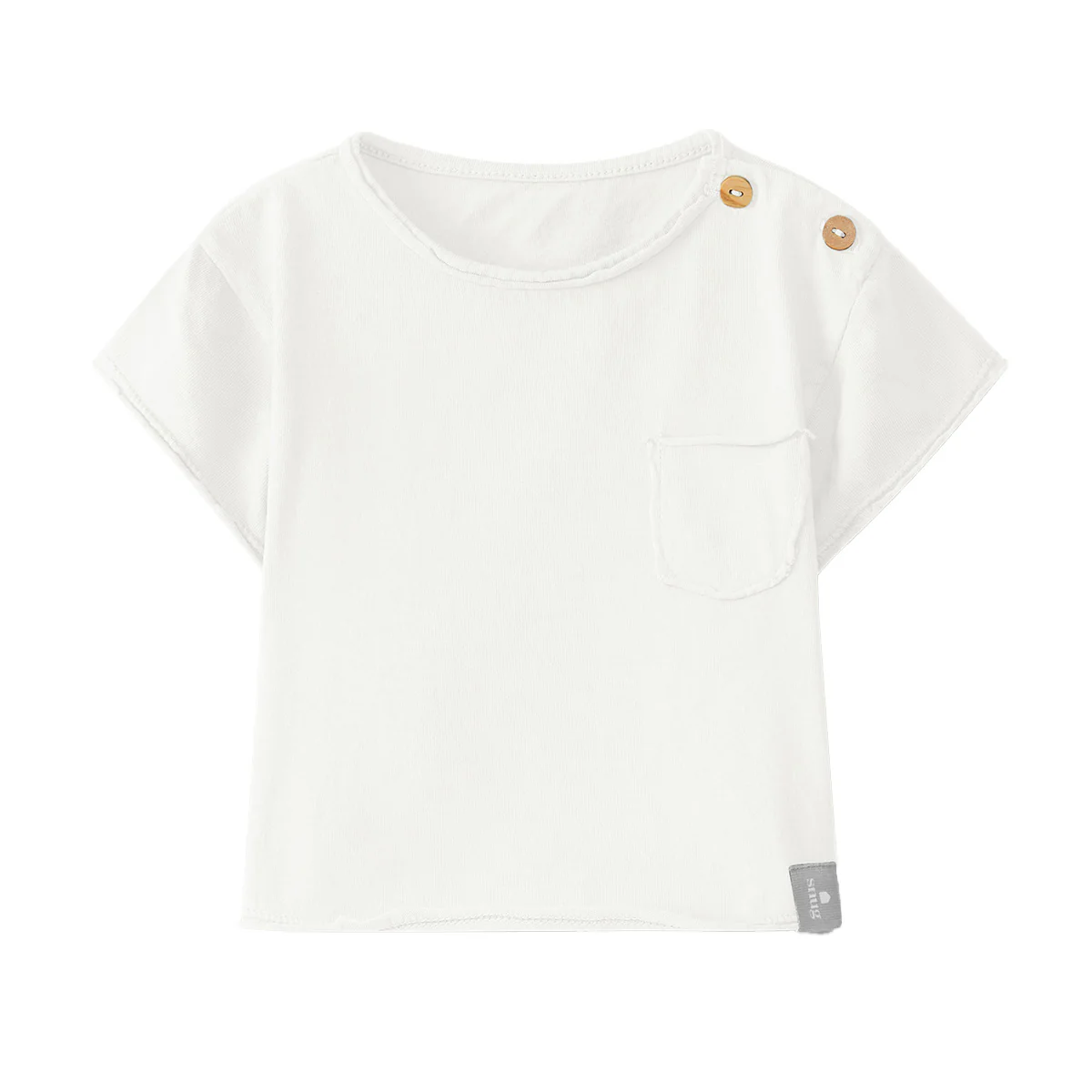 Luchtig, basic T-shirt voor de zomerse dagen. Twee houten knoopjes bij de schouder en een zakje op borsthoogte voor extra stijl.