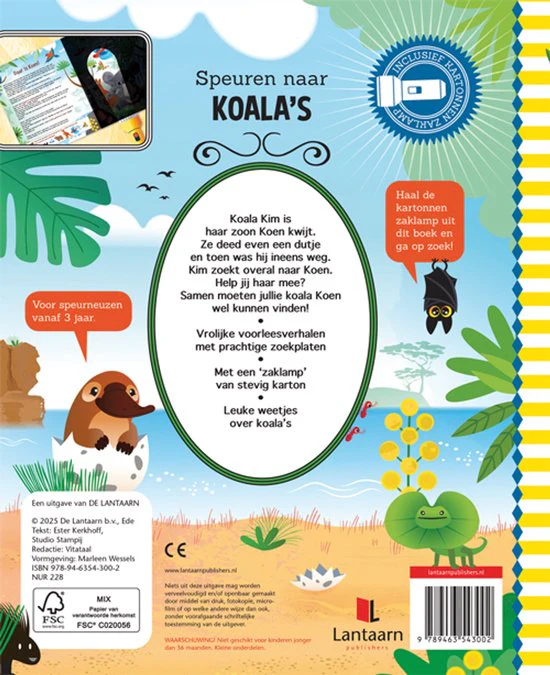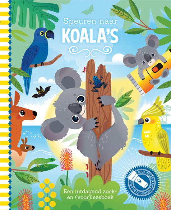 Koala Kim is haar zoontje Koen kwijt. Ze deed even een dutje en toen ze wakker werd, was Koen weg. Kim zoekt overal: in de woestijn, in het bos en zelfs op het strand. Help jij haar om Koen te vinden? Het boek begint met leuke weetjes en feitjes over koala’s. Hier kom je ook de kartonnen zaklamp tegen. Deze zaklamp heb je nodig voor de pagina’s die volgen. In het verhaal staan namelijk gekleurde woorden, die je op de rechterpagina kunt zoeken. Maar dat lukt alleen als je de zaklamp gebruikt! Schuif ‘m onder de zwarte pagina en je ziet dat er een lichtbundel ontstaat, waarmee je kunt zien wat Kim allemaal tijdens haar reis tegenkomt. Bekijk je ook de andere titels in deze serie?