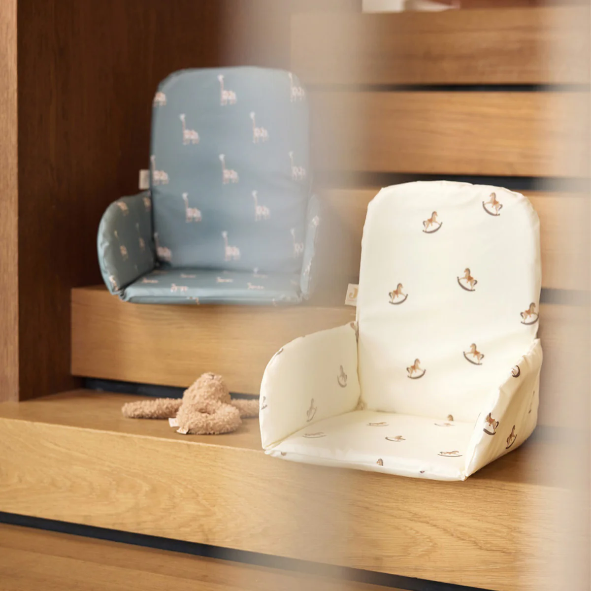 Zodra jouw baby zelfstandig kan zitten kan het ook zitten in een kinderstoel. Met dit kinderstoel kussen zit jouw kindje beter en veiliger. Je baby glijdt niet onderuit op de zitting en valt niet opzij. Het kussen geeft steun aan de billen, het ruggetje en het houdt je kindje meer op de plek. Het schattige Nostalgic Ride printje met hobbelpaardjes maakt etenstijd een feestje voor jouw kleine! De veiligheidsgordeltjes kun je door de gleufjes aan de zijkant van het kinderstoel kussen halen zodat je jouw kindje nog net zo makkelijk kan vastzetten in de stoel. Het kinderstoel kussen is afneembaar.