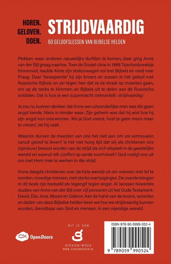 Anne daagde christenen over de hele wereld uit om mensen met lef te worden; moedige mensen, met sterke overtuigingen. De overdenkingen in dit boek zijn bedoeld als tegengif tegen angst. Al Janssen bewerkte studies van Anne van der Bijl over vijf personen uit het Oude Testament: David, Elia, Jona, Mozes en Gideon. Aan de hand van de levens, woorden en daden van deze Bijbelse helden leren we hoe we strijdvaardig kunnen worden, dienstbaar aan God en mensen, in een vijandige wereld.