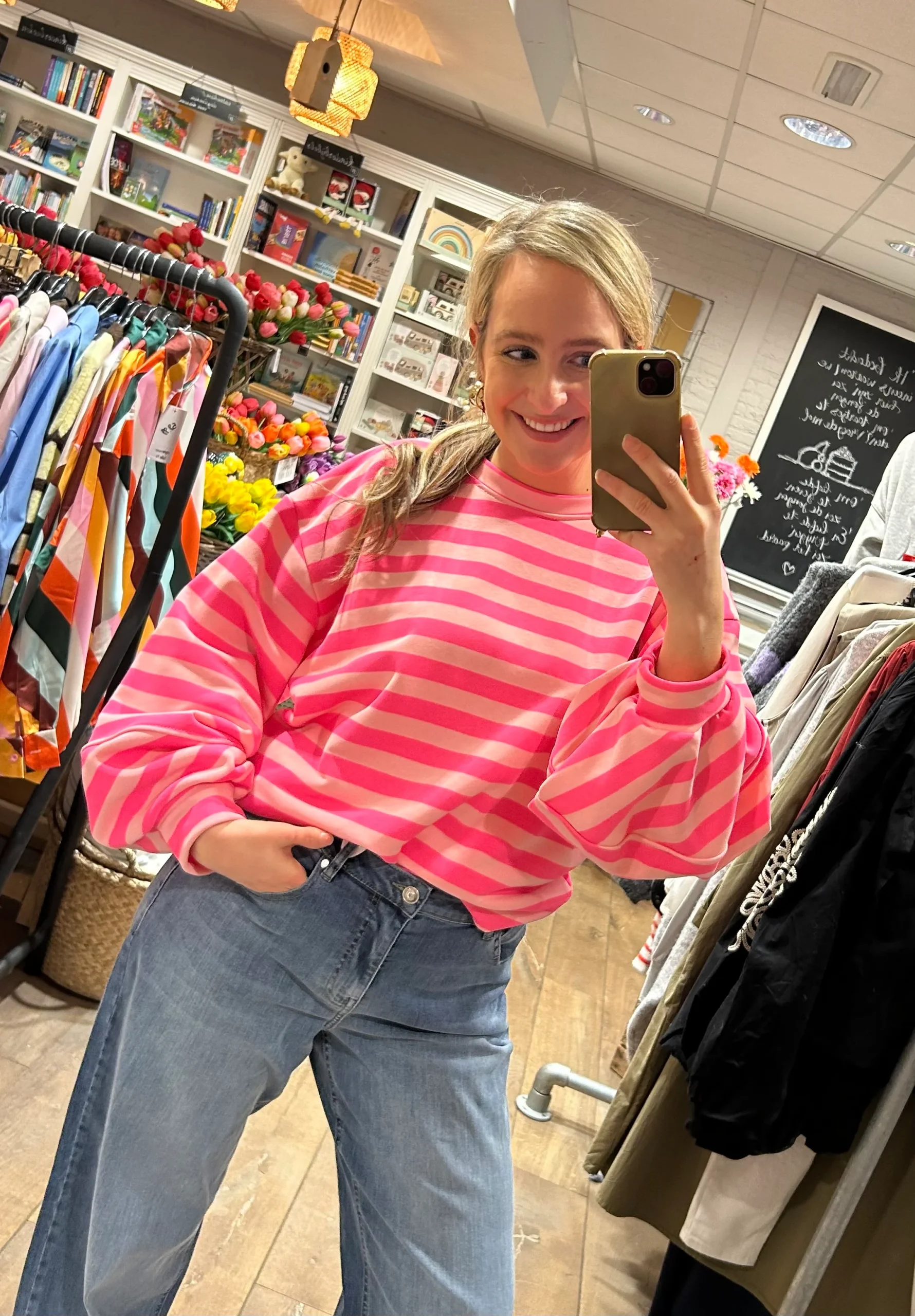Deze sweater is zó ontzettend leuk en helemaal spring proof! 🌷 Hij heeft een vrolijke streep met twee kleuren roze en check de mouwen, wat een leuk effect geeft deze pofmouw. Klaar voor het voorjaar! Daar word je toch vrolijk van?