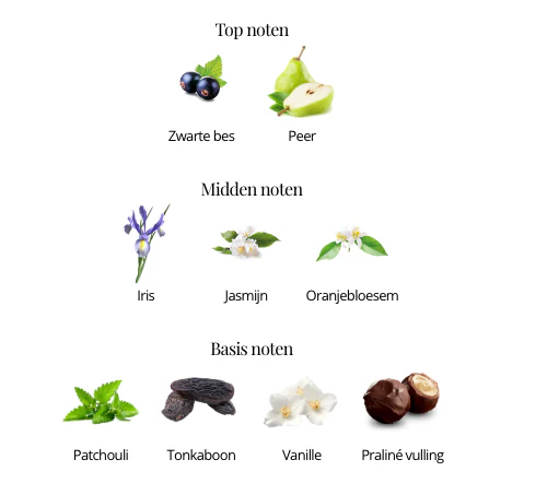 De volgende akkoorden zul je duidelijk ruiken in dit parfum zoet, vanille, fruitig, poederig, patchouli.