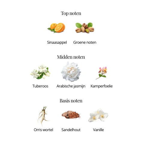 De volgende akkoorden zul je duidelijk ruiken in dit parfum witte bloemen, tuberoos, dierlijk, poederig, houtachtig.