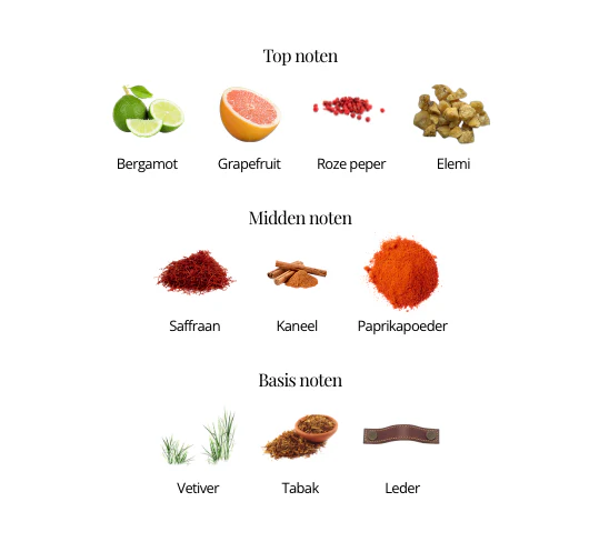 De volgende akkoorden zul je duidelijk ruiken in dit parfum warm kruidig, kaneel, tabak, zoet, leer, zacht kruidig.