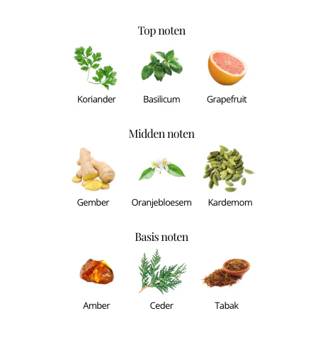 De volgende akkoorden zul je duidelijk ruiken in dit parfum amber, fris kruidig, tabak, citrusvruchten, zoet.