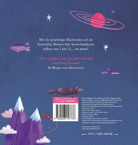 Telboek in stevige kartonnen uitvoering voor jonge kinderen, met een aantal prachtige illustraties uit de wereldwijde bestsellerSamen hier van veelbekroond kunstenaar Oliver Jeffers.