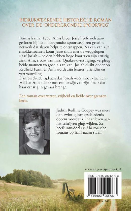 Terug naar Redfield Farm van Judith Redline Coopey is een historische roman die zich afspeelt in het 19e-eeuwse Amerika. Anns broer Jesse heeft zich aangesloten bij ‘de ondergrondse spoorweg’, een geheim netwerk dat slaven helpt te ontsnappen. Na een van zijn smokkeltochten komt Jesse thuis met de weggelopen slaaf Josiah – beiden hebben hoge koorts en zijn ernstig ziek. Ann verpleegt beide mannen zo goed als ze kan. Josiah duikt onder op Redfield Farm en Ann wordt zijn lerares, vriendin en vertrouweling. Dan breekt de tijd aan dat Josiah weer moet vluchten. Hij laat Ann achter met een bewijs van zijn liefde dat haar ernstig in gevaar brengt.