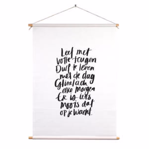 Een bijzondere textielposter met de handgeschreven tekst van het bekende lied “Leef met volle teugen”, dat Kinga Bán samen met Egbert Smelt heeft gezongen. “Leef met volle teugen, durf te leven met de dag. Glimlach elke morgen, er is iets moois dat op je wacht”. Een waardevolle tekst op deze stijlvolle textielposter om zelf in huis op te hangen of om cadeau te geven.
