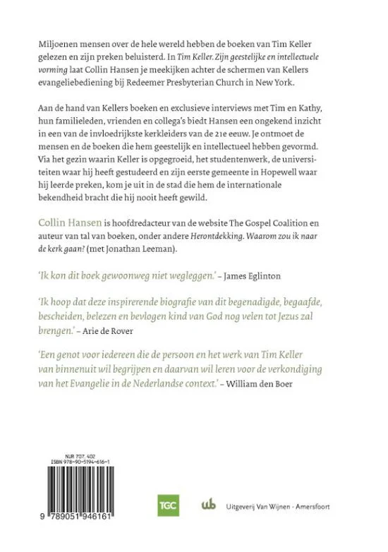 Miljoenen mensen hebben zijn boeken gelezen en naar zijn preken geluisterd. Maar welke mensen en welke gebeurtenissen hebben het denken en de geestelijke groei van Tim Keller zelf gevormd? Aan de hand van Kellers persoonlijke notities en preken, en exclusieve interviews met zijn familie en oude vrienden geeft Collin Hansen je een verrassende kijk in de ziel van een van de meest invloedrijke kerkleiders van de 21e eeuw. Het verhaal van Timothy Keller is het verhaal van zijn spirituele en intellectuele invloeden, van de vrouw die hem de bijbel leerde lezen en de professor die hem leerde preken over Jezus, tot de filosoof die hem onder het oppervlakte van de maatschappij leerde kijken.
