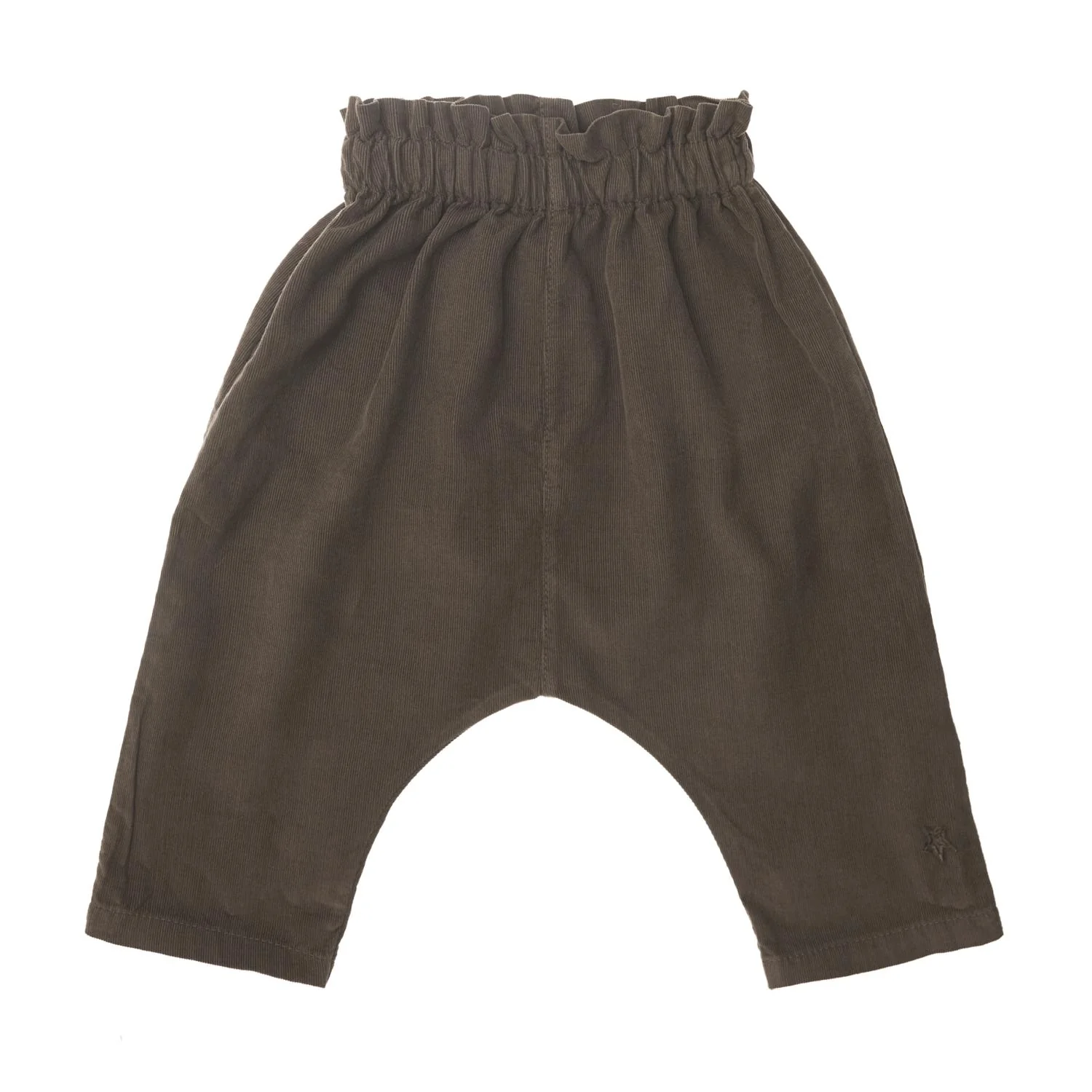 Baggy babybroekje van microdenim met elastische taille. Deze baggy pants zijn unisex en hebben een tijdloze bruine kleur. Een fijn item voor de herfst/winter garderobe van jouw kindje.