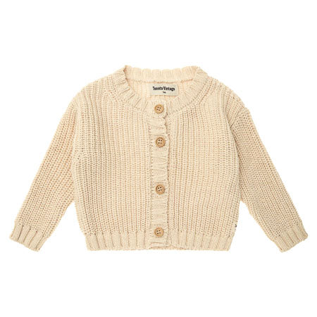 Een parelmoer gebreid vestje van biologisch katoen. Sluit aan de voorkant middels houten knoopjes. Een fijn en warm basic item van Tocoto Vintage. Kan voor zowel jongen als voor meisje. Het vestje een crème / zacht beige tint.