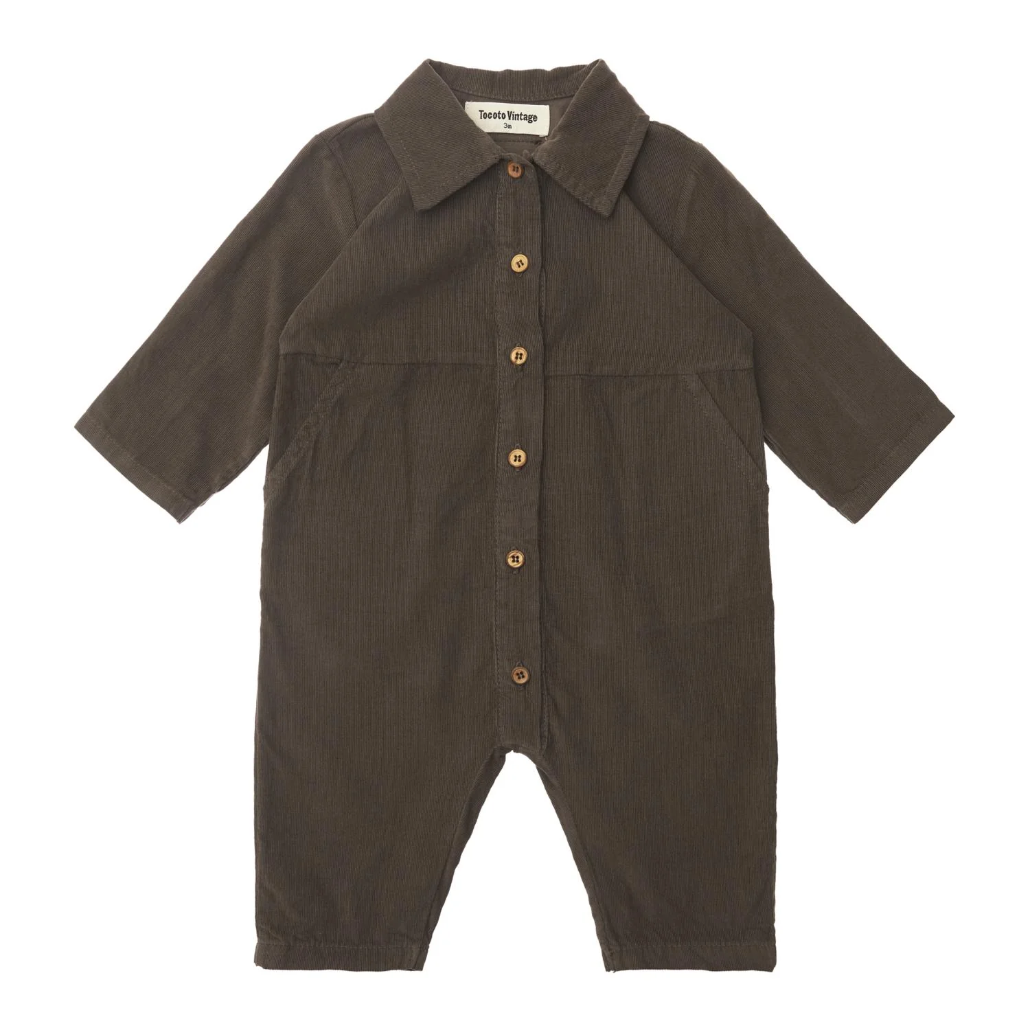 Lange babyjumpsuit van microcorduroy met een kraag in overhemdstijl. Dit jumpsuit van subtiele ribstof heeft een mooie diep bruine kleur, houten knopen aan de voorkant en schuine zijzakken.