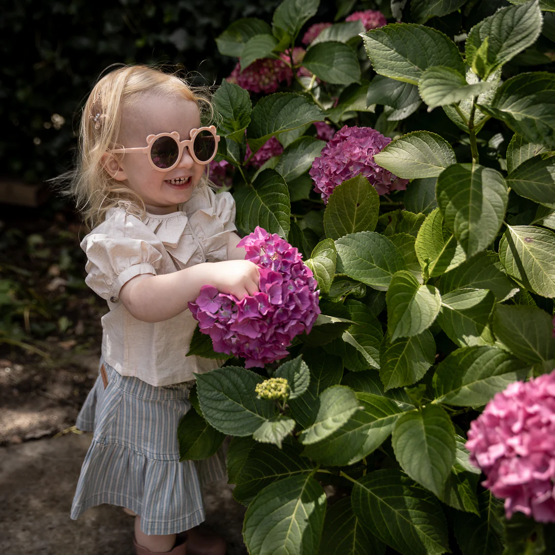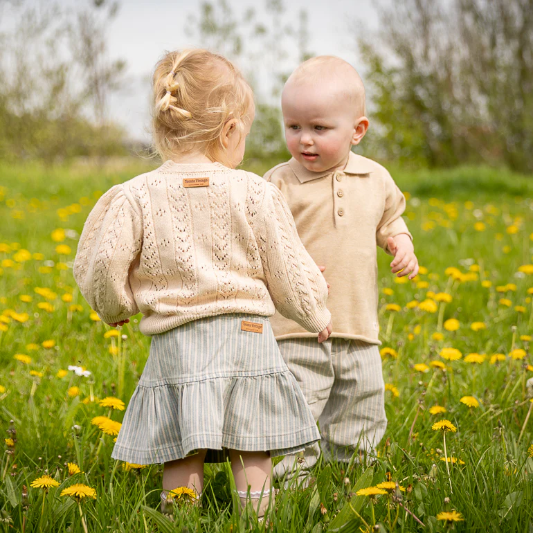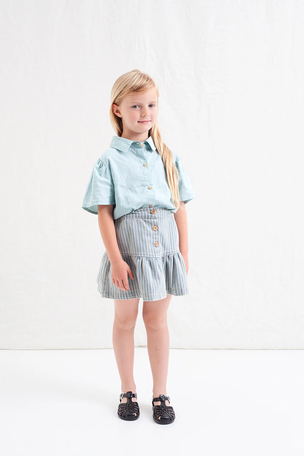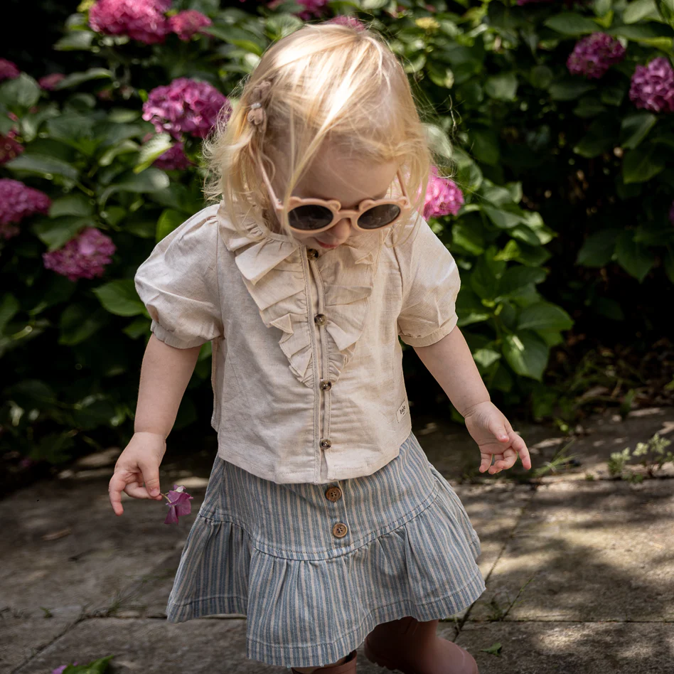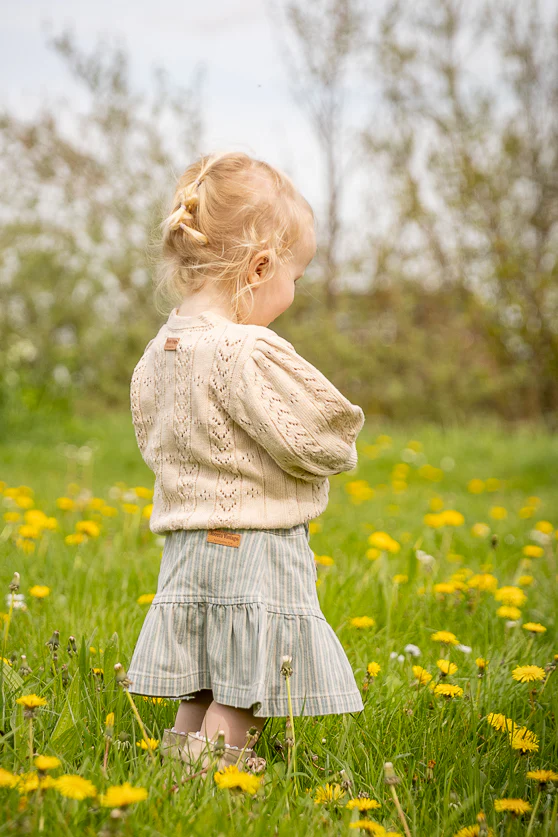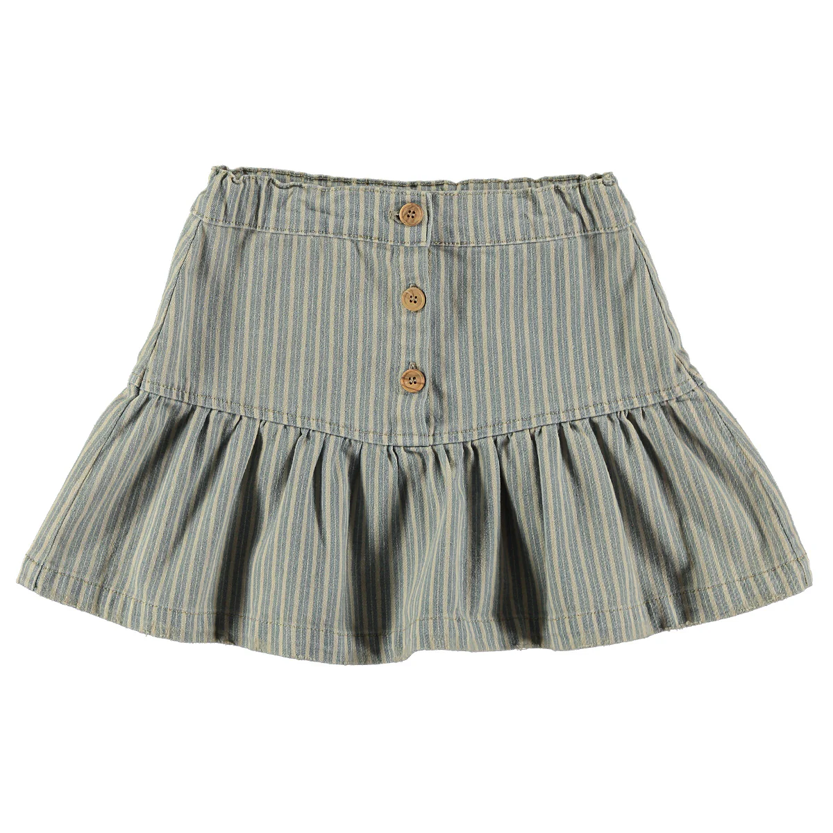 Korte denim rok met gestreepte print en ruches. Smalle taille en sluiting met 3 knopen. De rok heeft een gewassen effect.