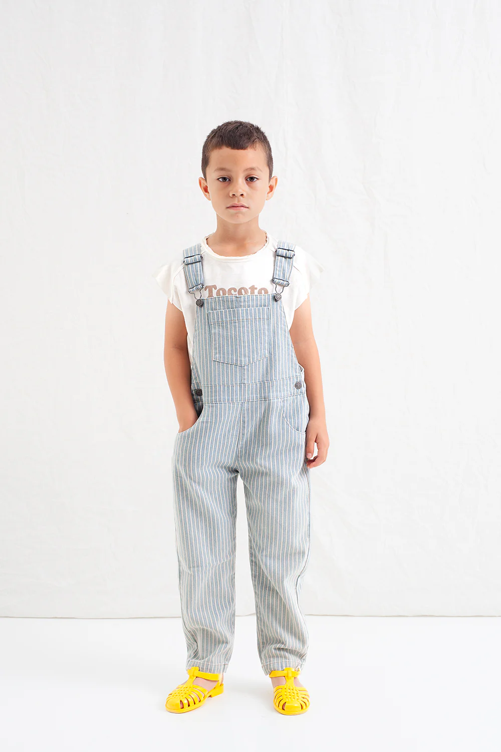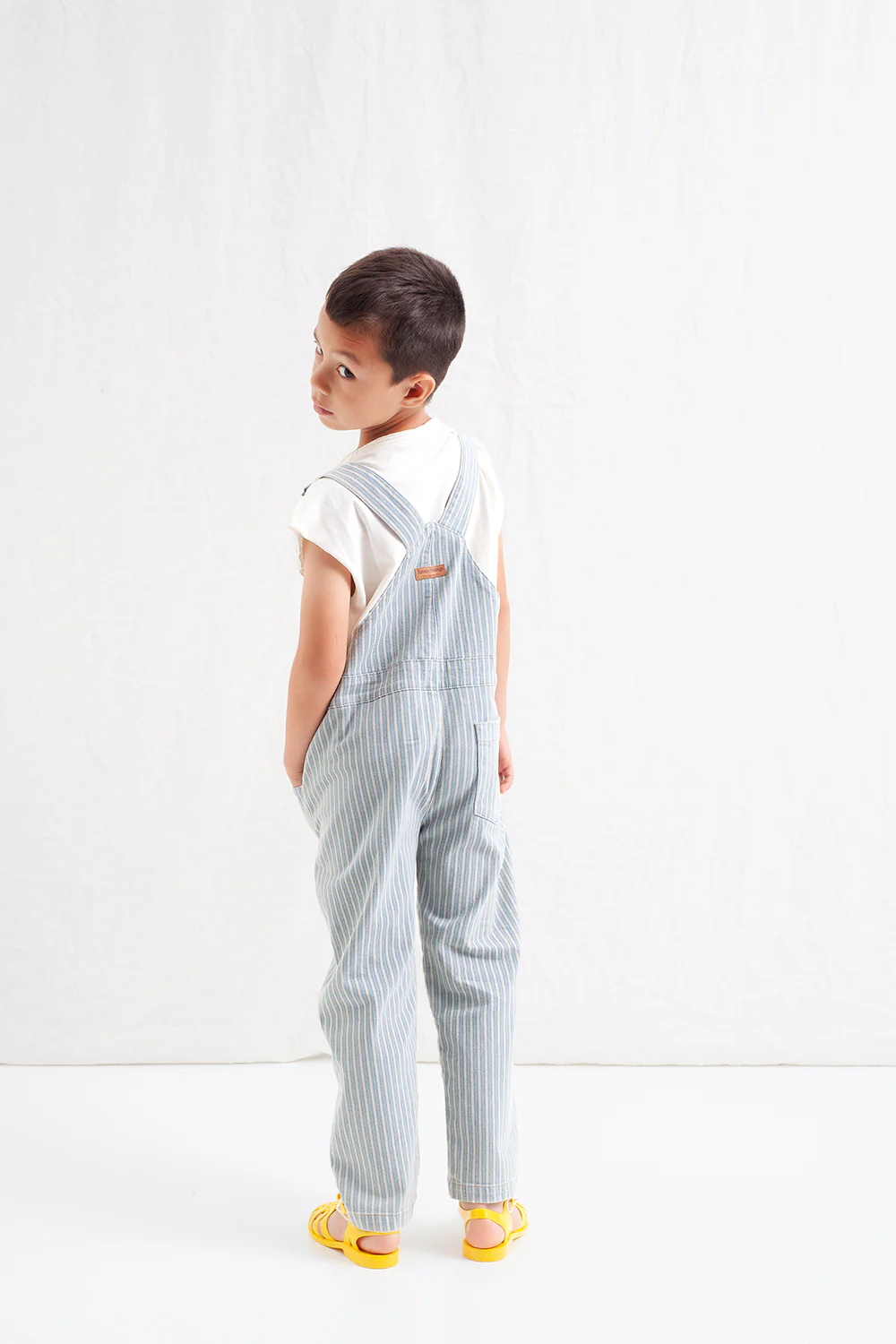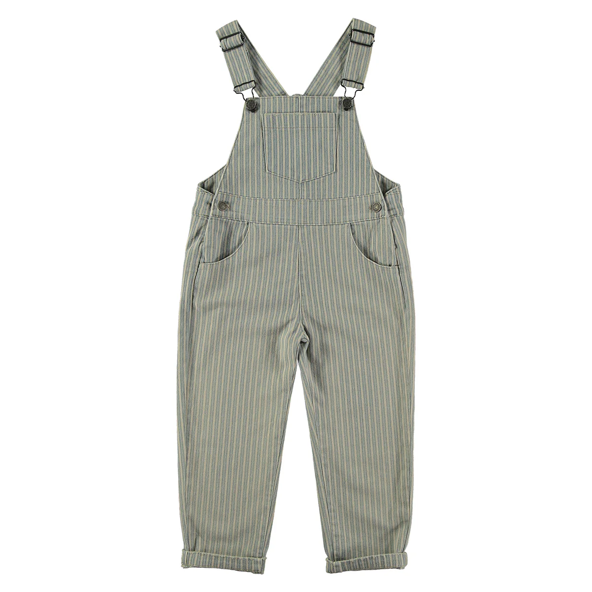 Lange denim overall met gestreepte print en een gewassen effect. De tuinbroek heeft diverse zakken. Midden voor zit er een zak, verder heeft de overall schuine steekzakken en een kontzak rechts achter. Gemaakt van een mix van katoen (96%) en elastaan (4%) voor meer comfort.