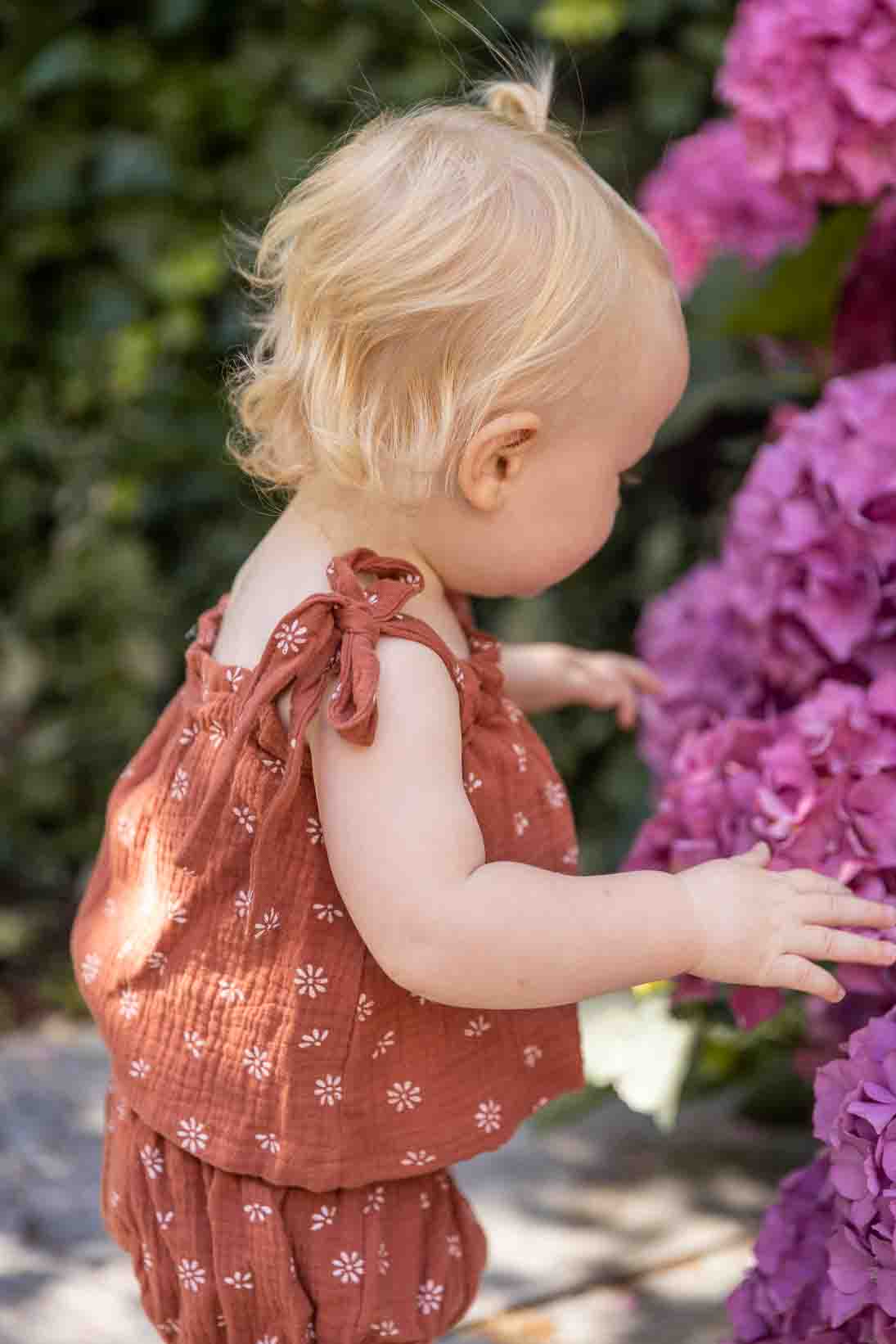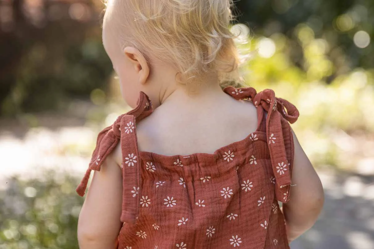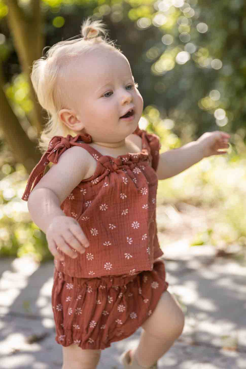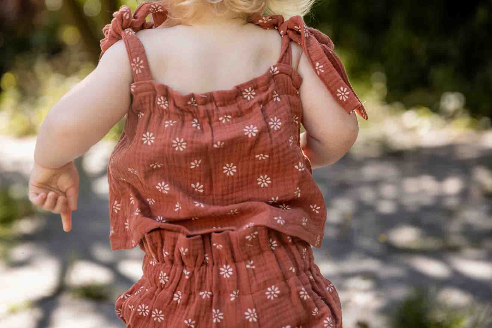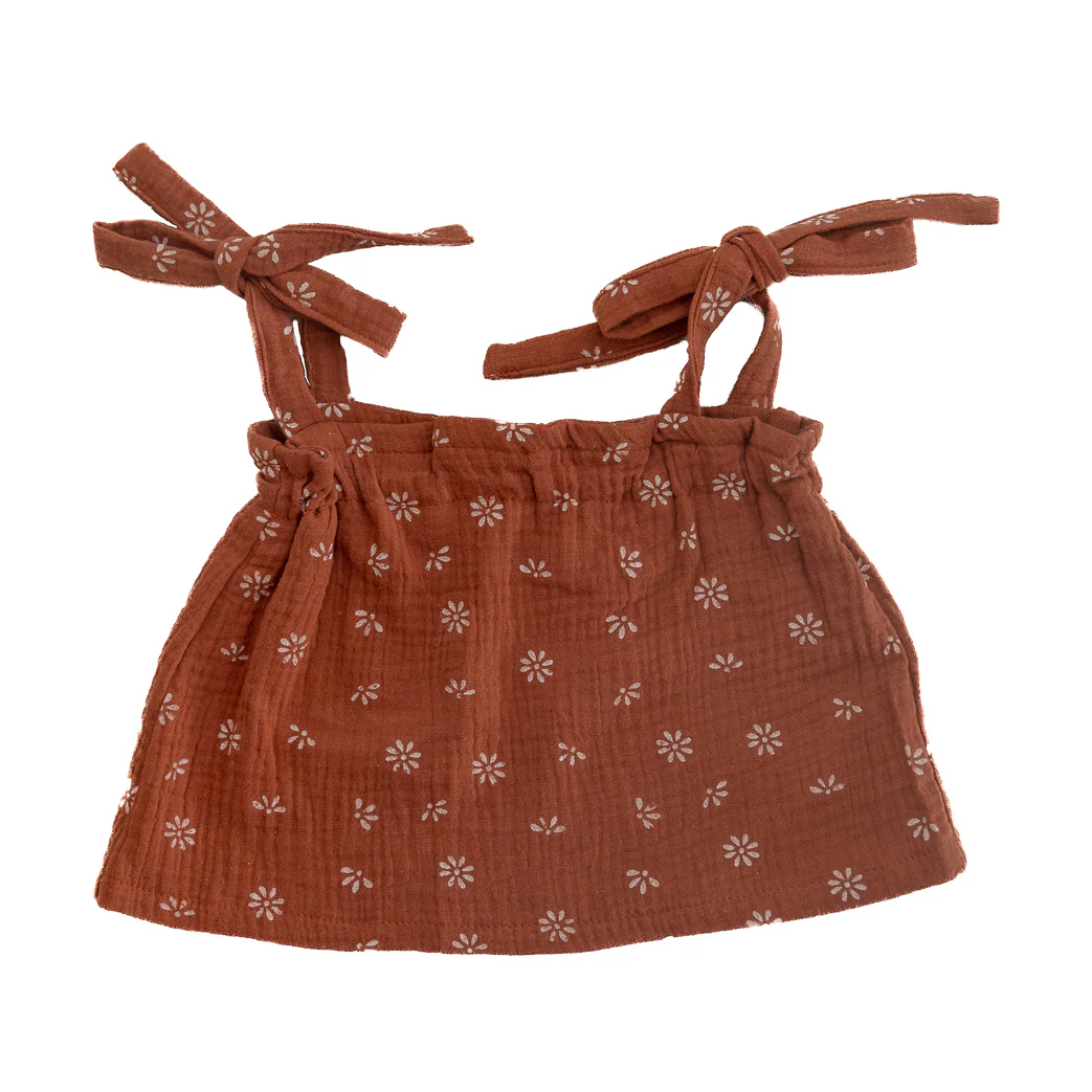 Deze zomerse mousseline top past perfect bij de bloomer in dezelfde kleur. De kleur brique is het beste te beschrijven als roestrood en staat bij elke huidskleur mooi. Doordat de schouderbandjes geknoopt moeten worden is de lengte van de top naar wens af te stellen. Deze muslin top is met liefde en met de hand gemaakt door een moeder in Slovenië.