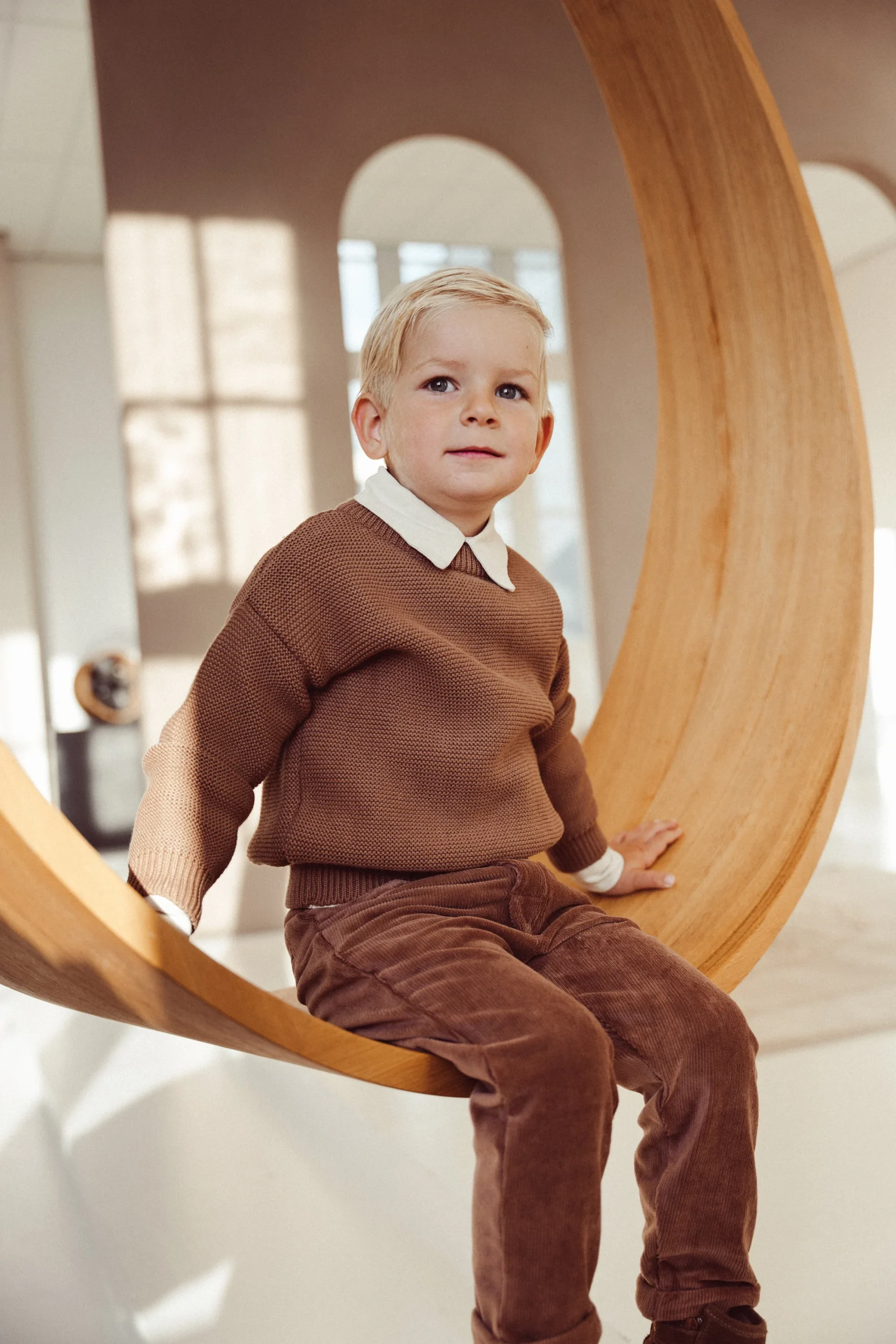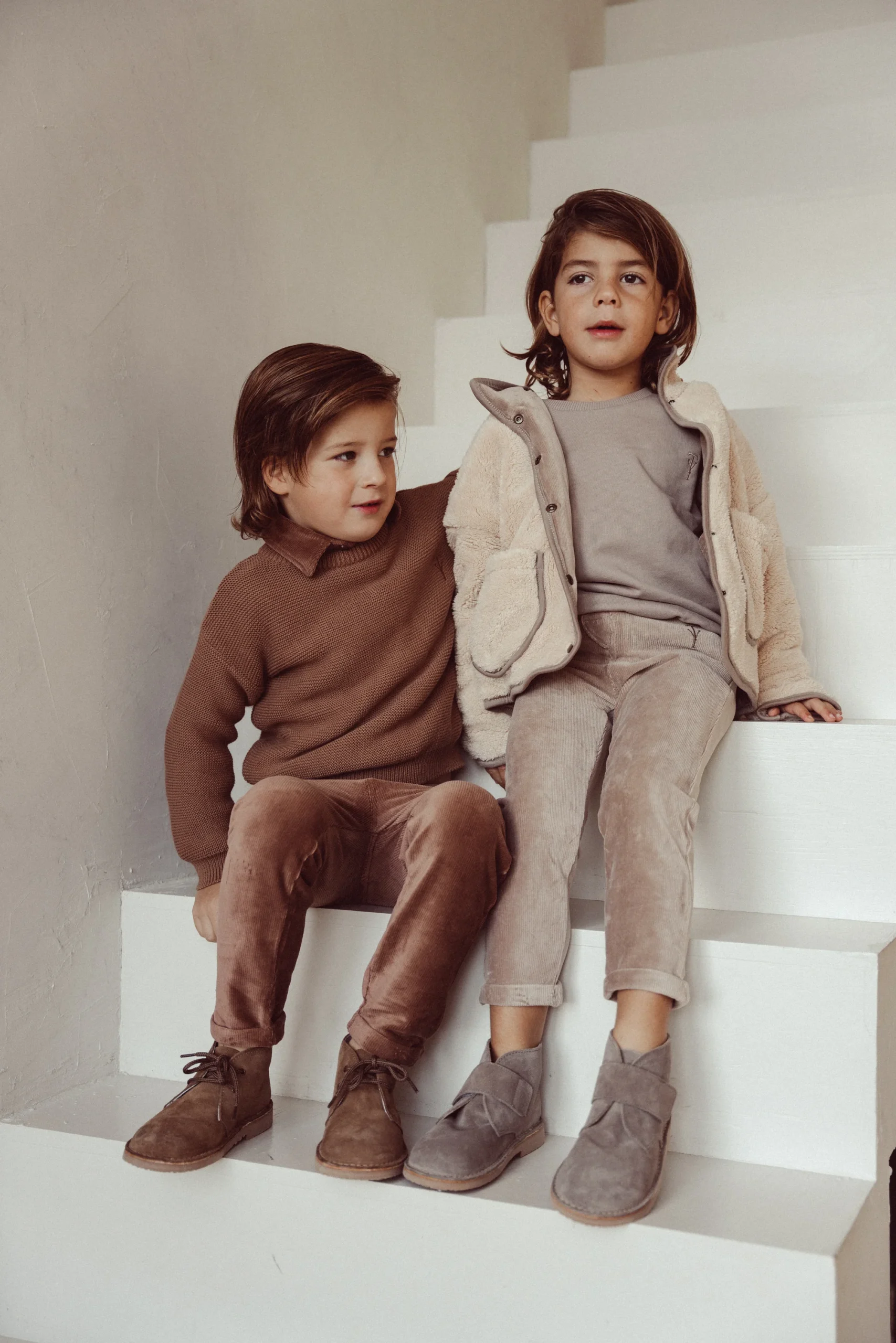 Winterbroek voor jongens van Two You Label. De broek heeft een subtiele velvet rib. De velvet is niet glanzend. De kleur van de broek is minder bruin als op de productfoto’s, de kleur komt beter overeen met de gestylde foto’s