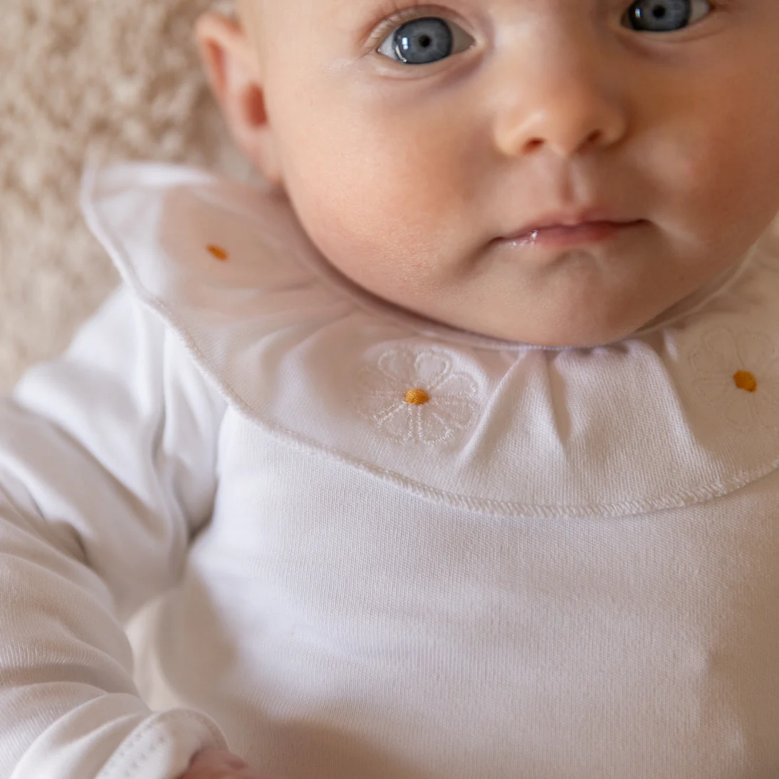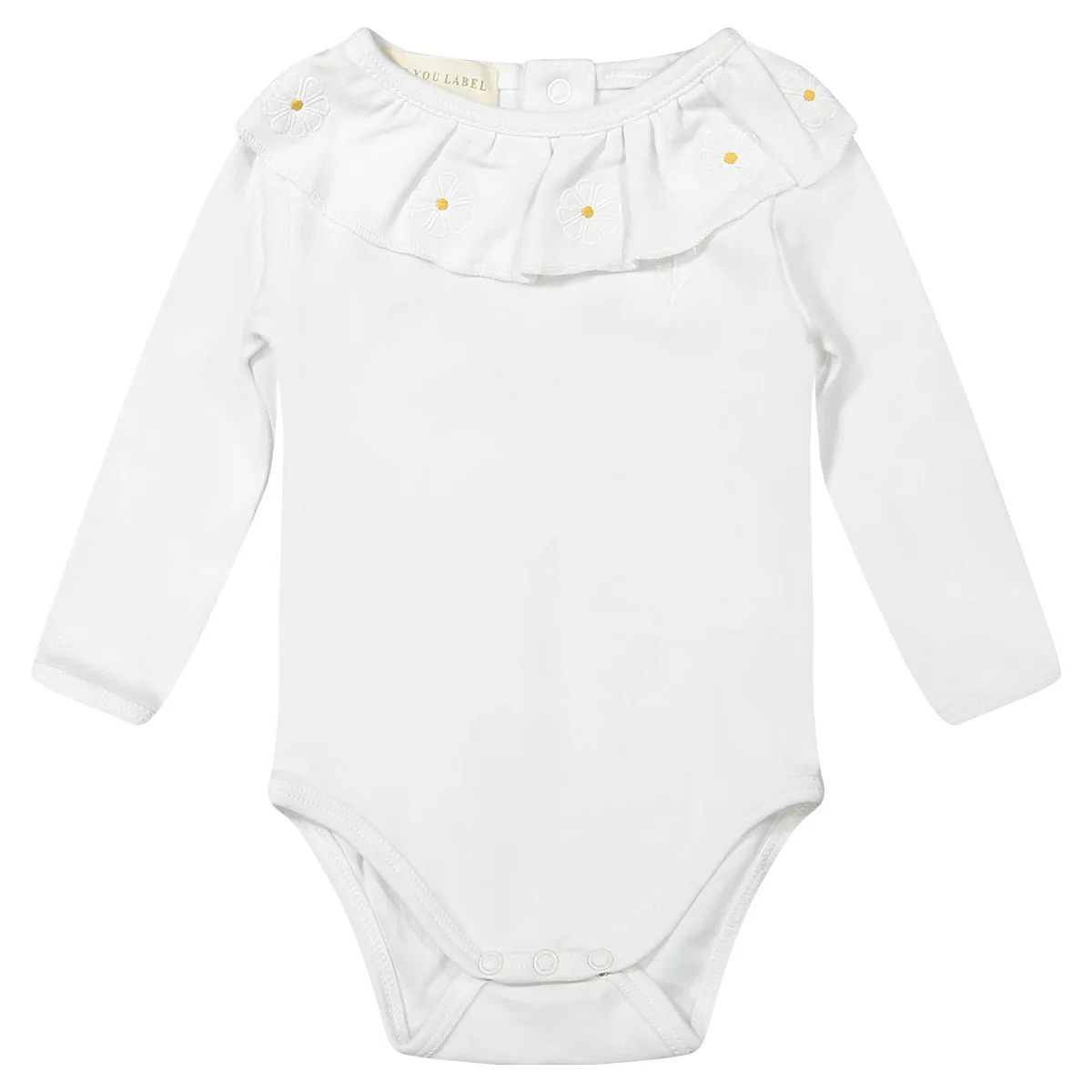 Schattig wit baby rompertje voor meisjes. Kraag van ruches met mooie bloemetjes erop. De bloemen zijn geborduurde madeliefjes en hebben gele details (hart van de bloem). Flora romper van Two You Label is ook beschikbaar in de kleur beach (licht beige).