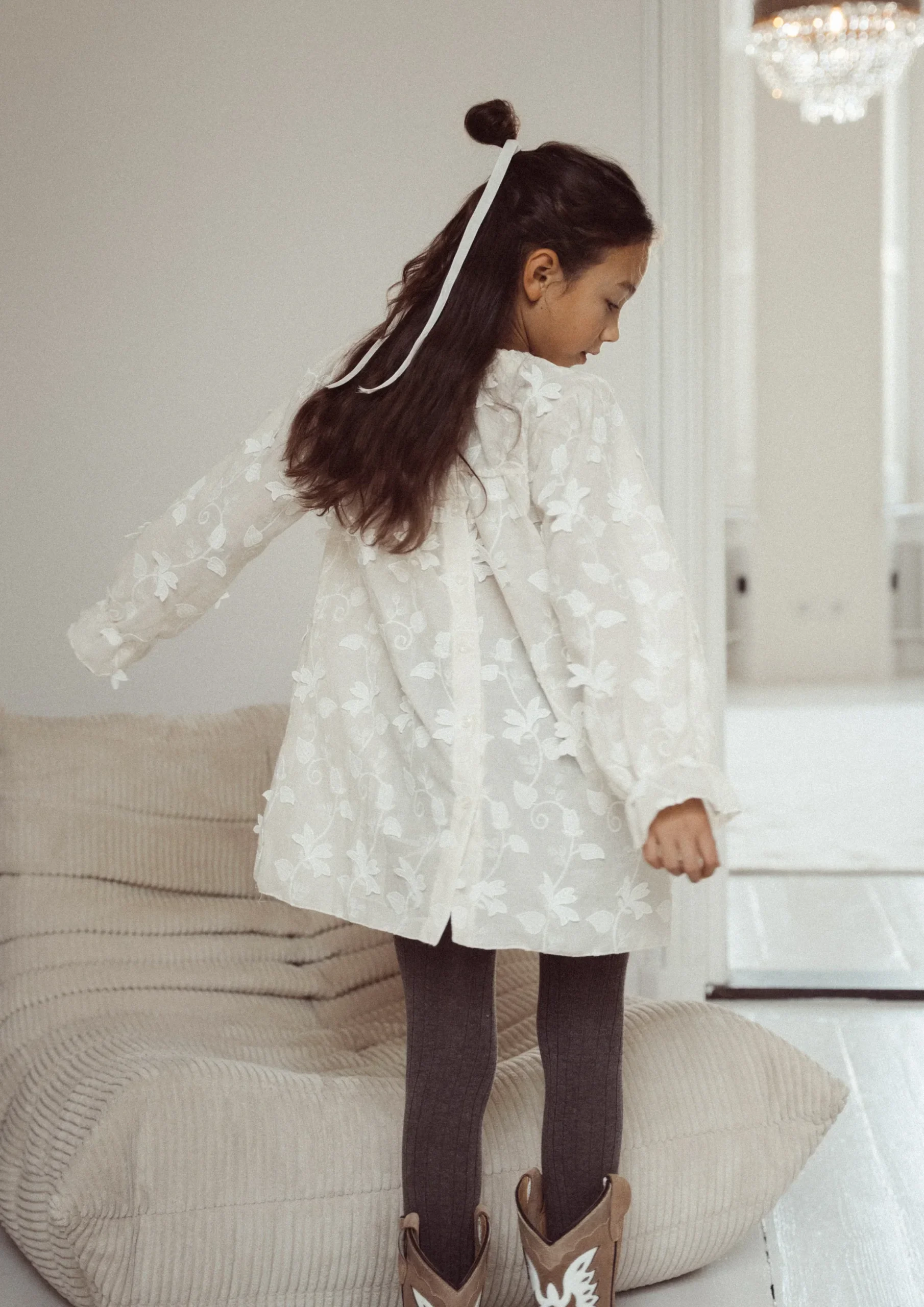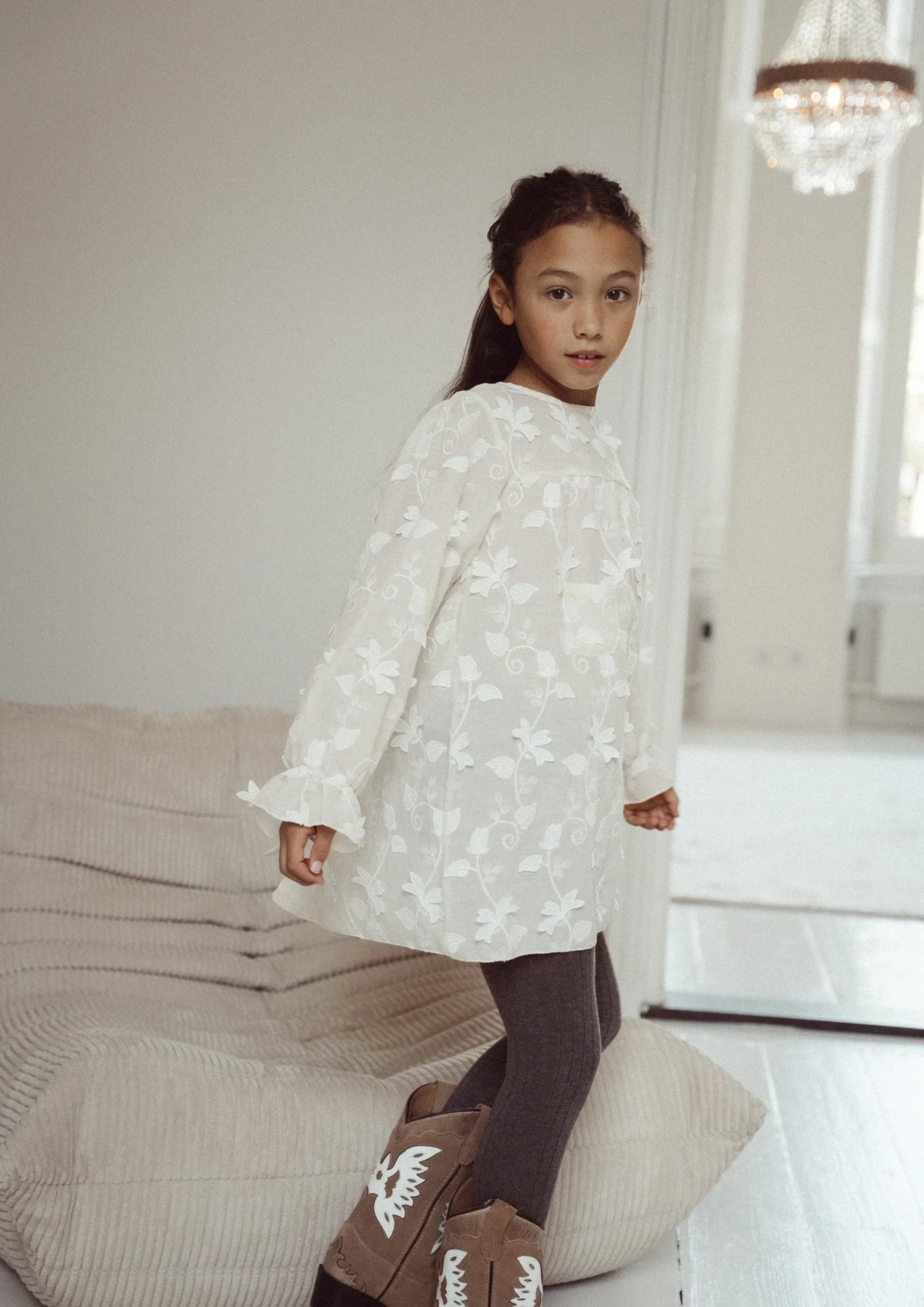 De crème kinderjurk heeft een doorlopende knoopsluiting aan de achterkant.