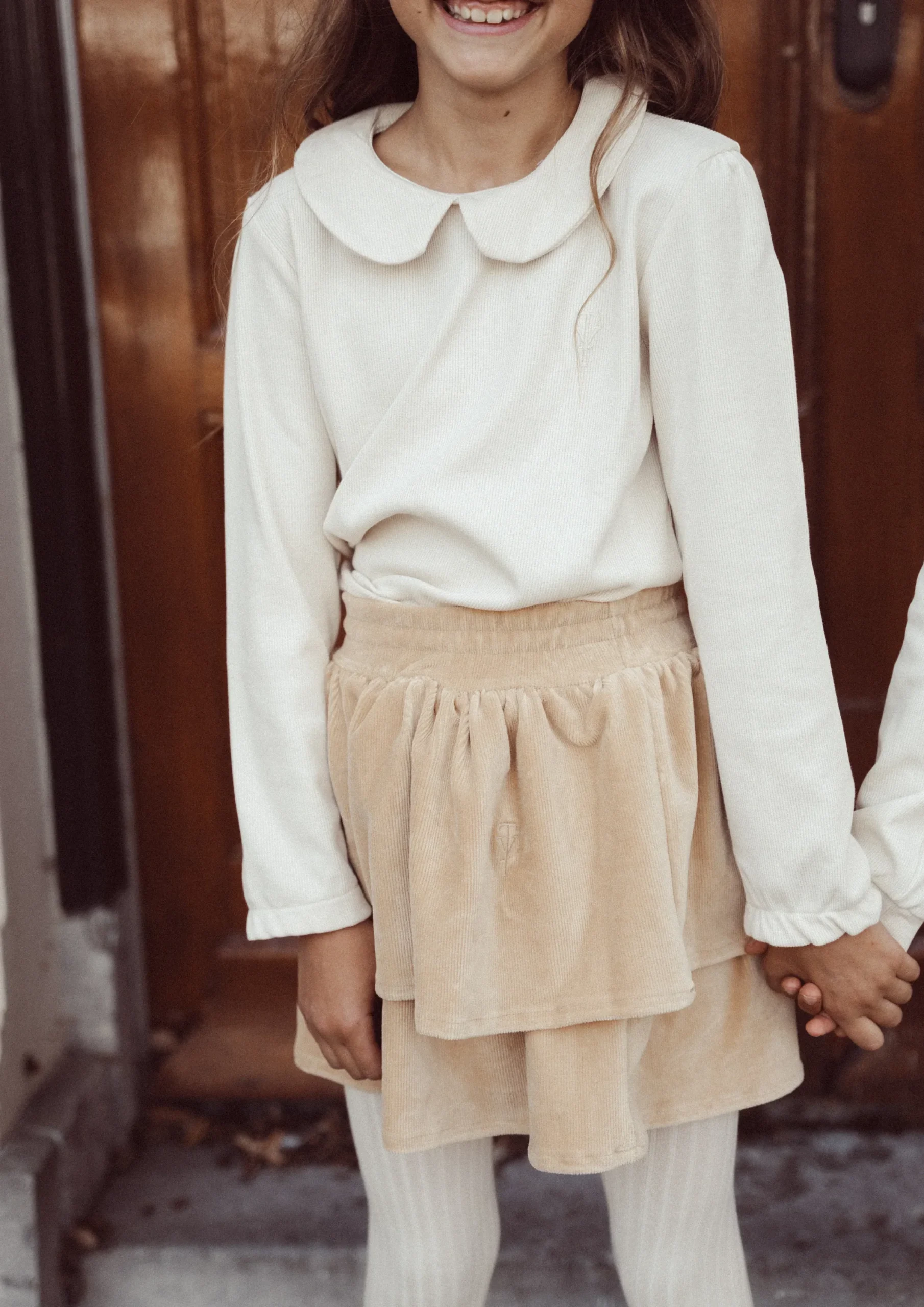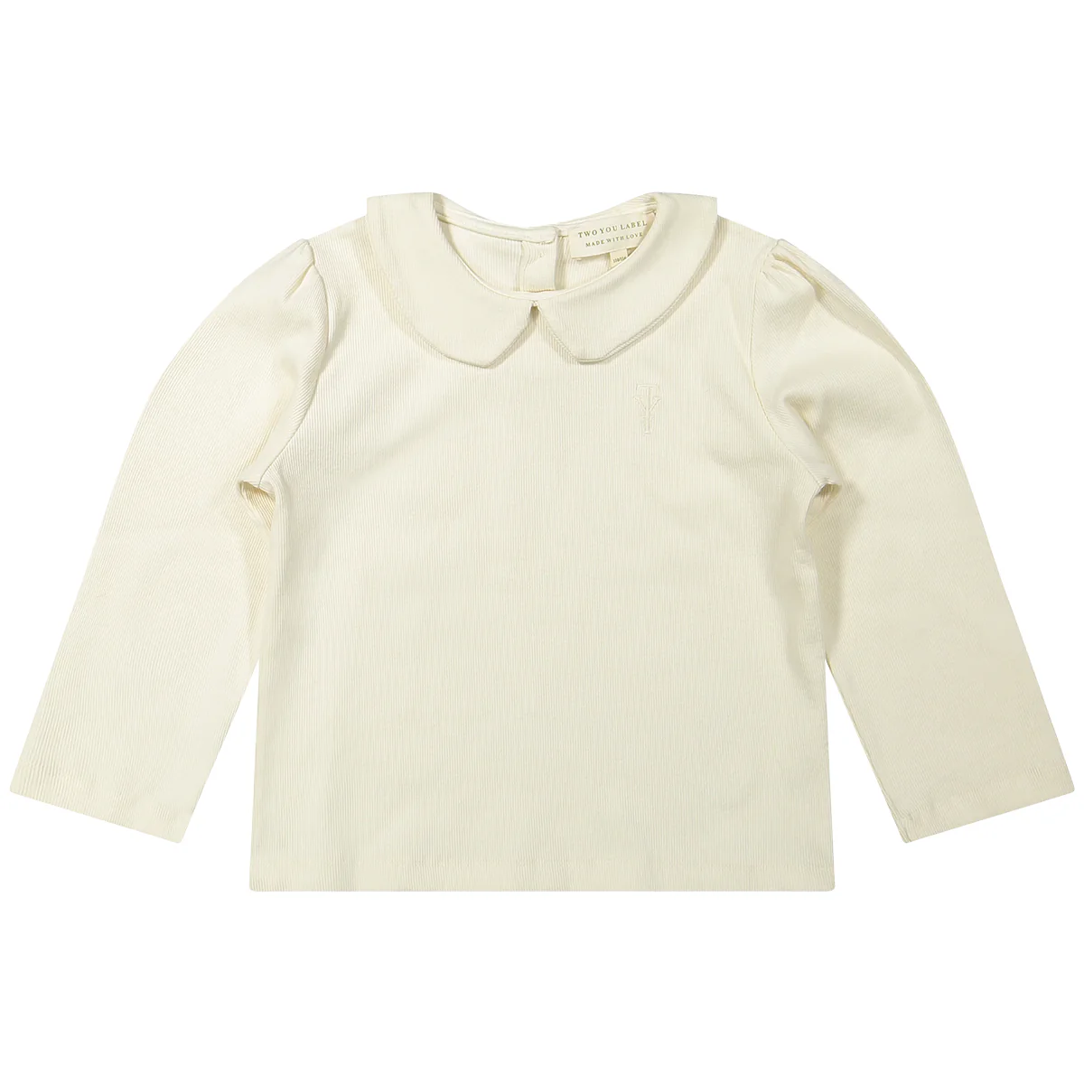Fijne basic top met lange mouwen voor meiden. Top Bibi van kinderkleding merk Two You Label is gemaakt van een fijne rib stof en heeft een leuk rond kraagje. Door het kraagje is Bibi ook een uitstekend item om onder een trui of een vest te dragen. De kleur beach is een offwhite/creme tint.